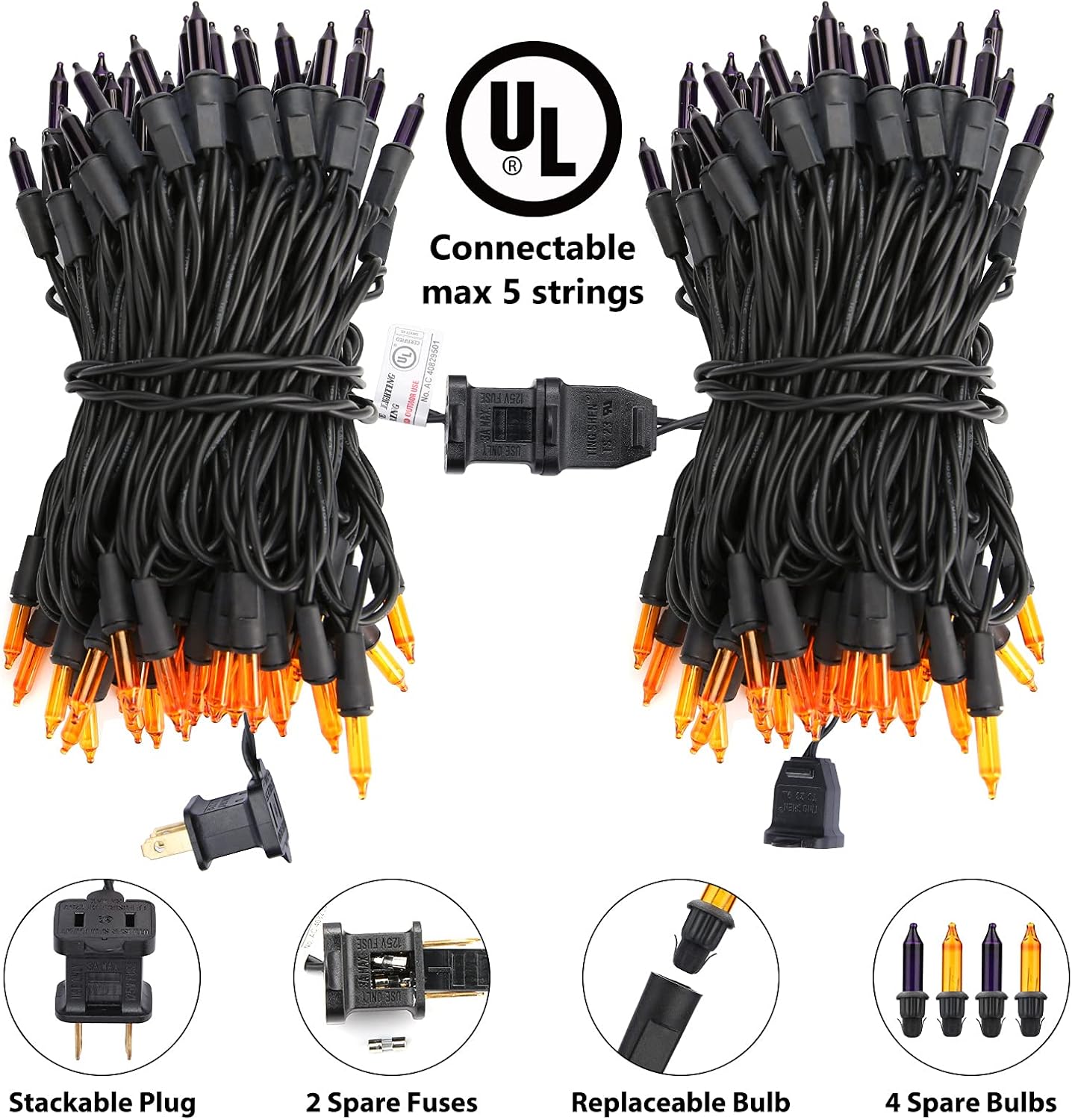 - End-to-End Connectable & Easy to Install: Each Halloween string light features a male and a female safe plug, an easy end-to-end connection allows up to 5 strands (125ft in total) connected together to illuminate a wider range. Just hang the string light on wherever you like, power on, you will get a charming night with these bright lights!