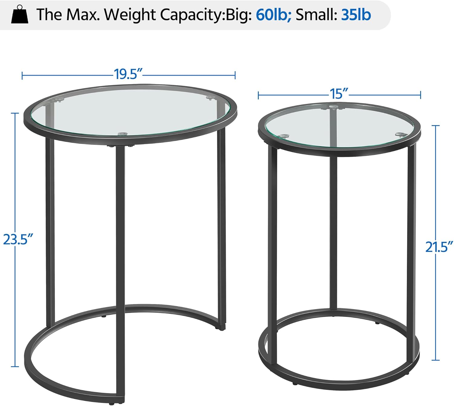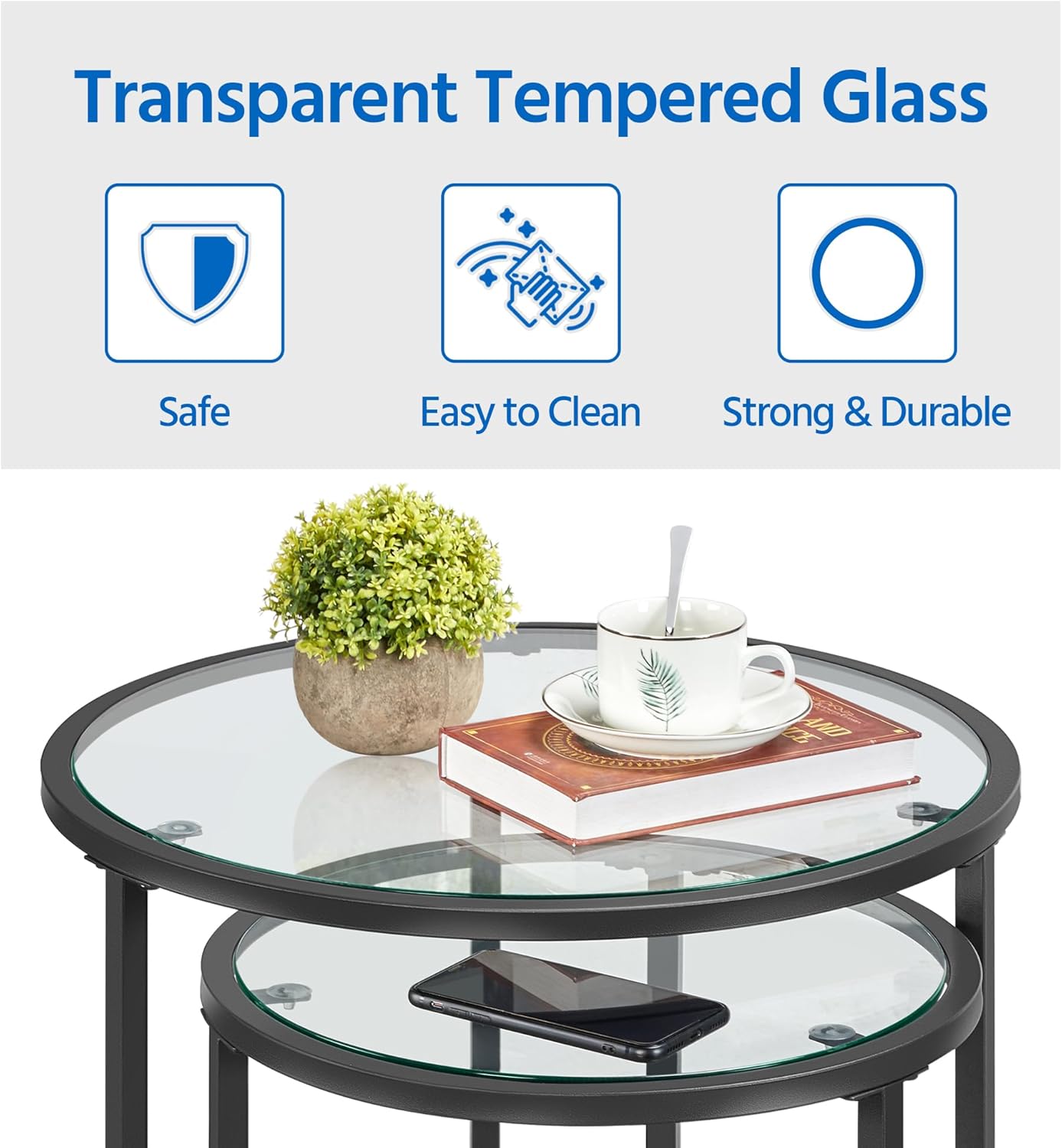 Yaheetech Round Nesting End Table Set of 2,Stacking Side Tables,Coffee Tables Set w/Metal Frame & Glass Top & Protective Foot Pads for Small Space, Living Room, Office- Black