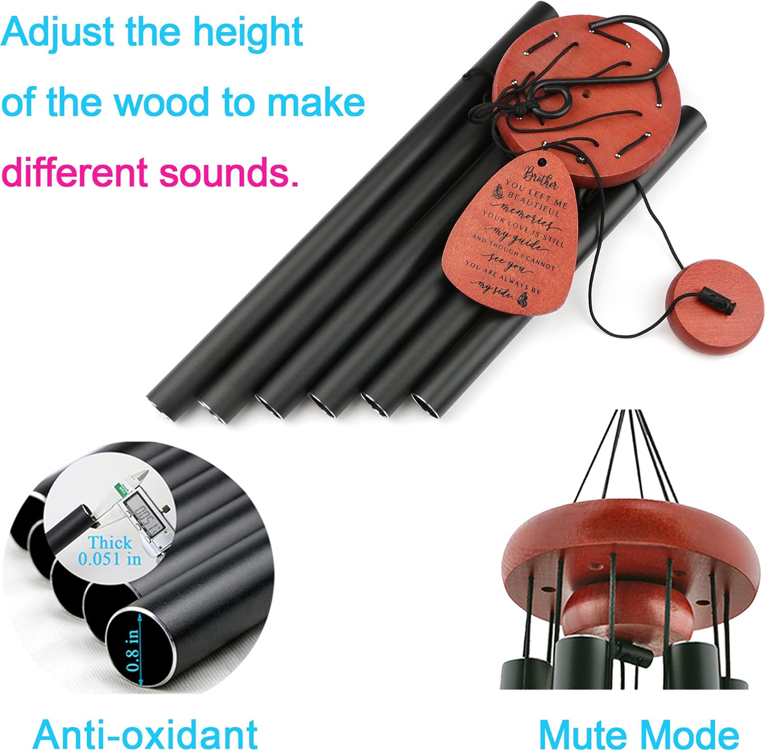 - Premium Quality Memorial Wind Chimes: Made with high-quality aluminum tubes and a corrosion-resistant black anodized finish, these memorial wind chimes produce clear, beautiful tones. The bell holder, striker, and wind catcher are made from durable beech wood, and the entire structure is supported by a strong, weather-resistant nylon cord for lasting outdoor use