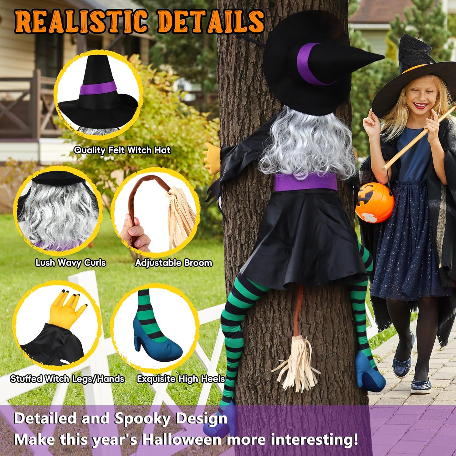 - Detailed Witch Design – Features a classic pointed black hat, long wavy silver hair, striped green-and-black stockings, and bright blue shoes. Every detail brings this whimsical witch to life for a realistic and fun display.