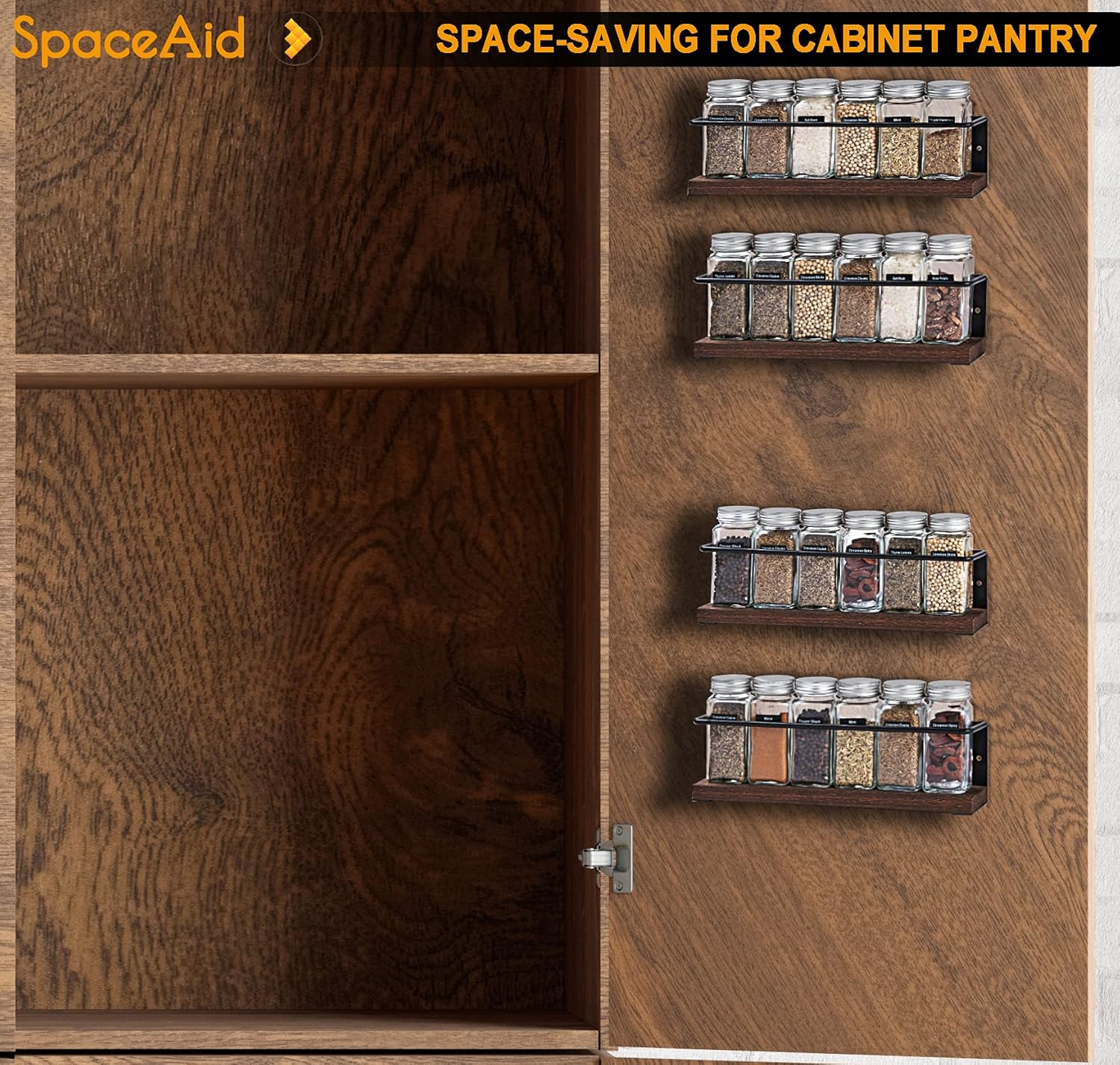 SpaceAid Spice Rack Organizer for Cabinet Door or Wall Mount (4 Pack) with 415 Spice Labels - Wood Hanging Seasoning Shelf for Cupboard Pantry or over the Stove