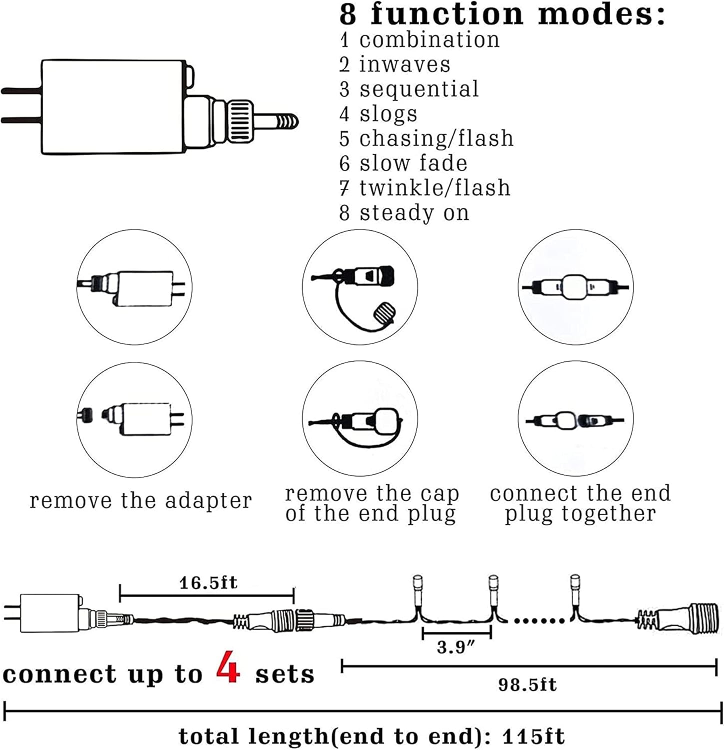 - 8 Modes: Halloween 300 LED string lights with 8 light modes: combination, in waves, sequential, slogs, chasing/flash, slow fade, twinkle/flash, by pressing the button on the plug to change the mode.