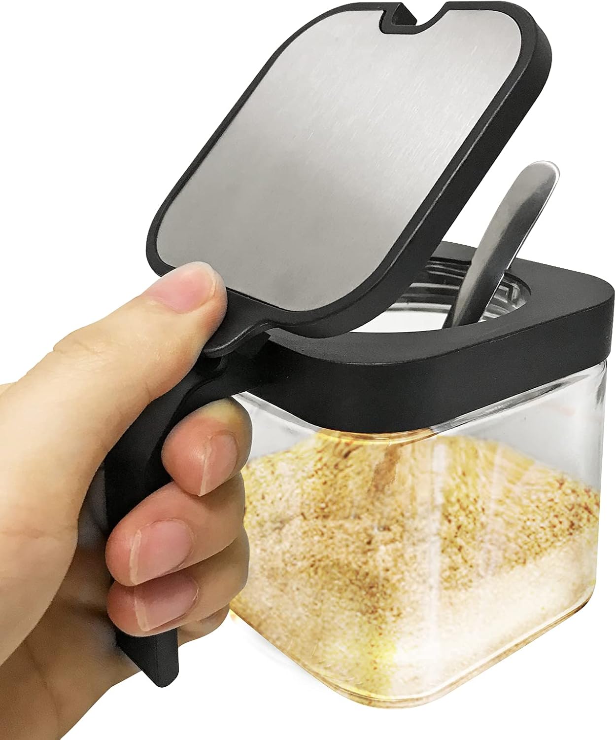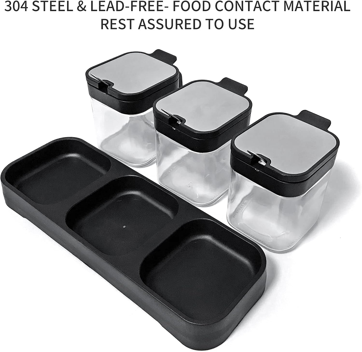 - Set of 3 sugar and salt container is made of lead-free glass, Matching 304 stainless steel spoons, non-toxic harmless to humans.it will keep spices clean and moisture resistance. It easy to use and clean.