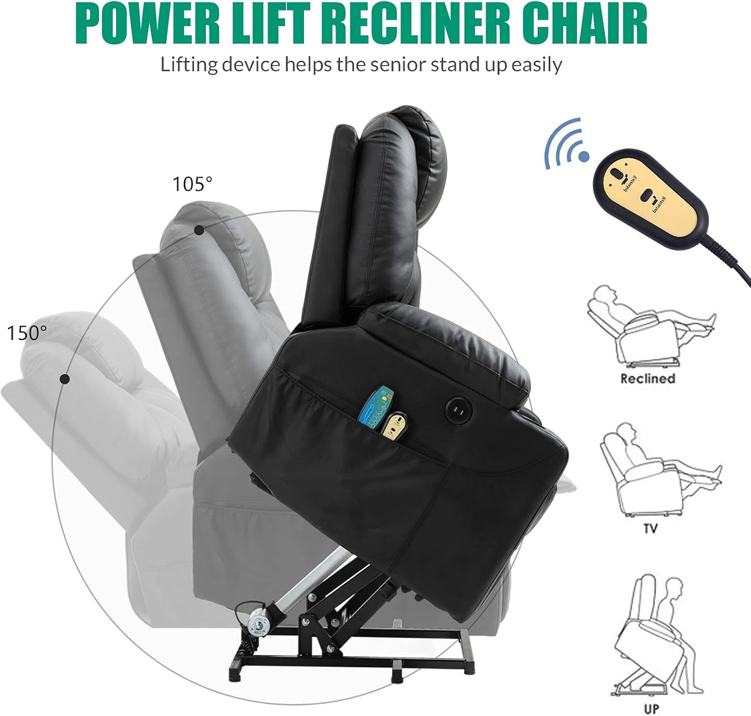 VIVIJASON Power Lift Chair Electric Recliner for Elderly Heated Vibration Massage Faux Leather Recliner Chair with 2 Remote Controls, Cup Holders, Side Pockets & USB Ports for Living Room (Black)