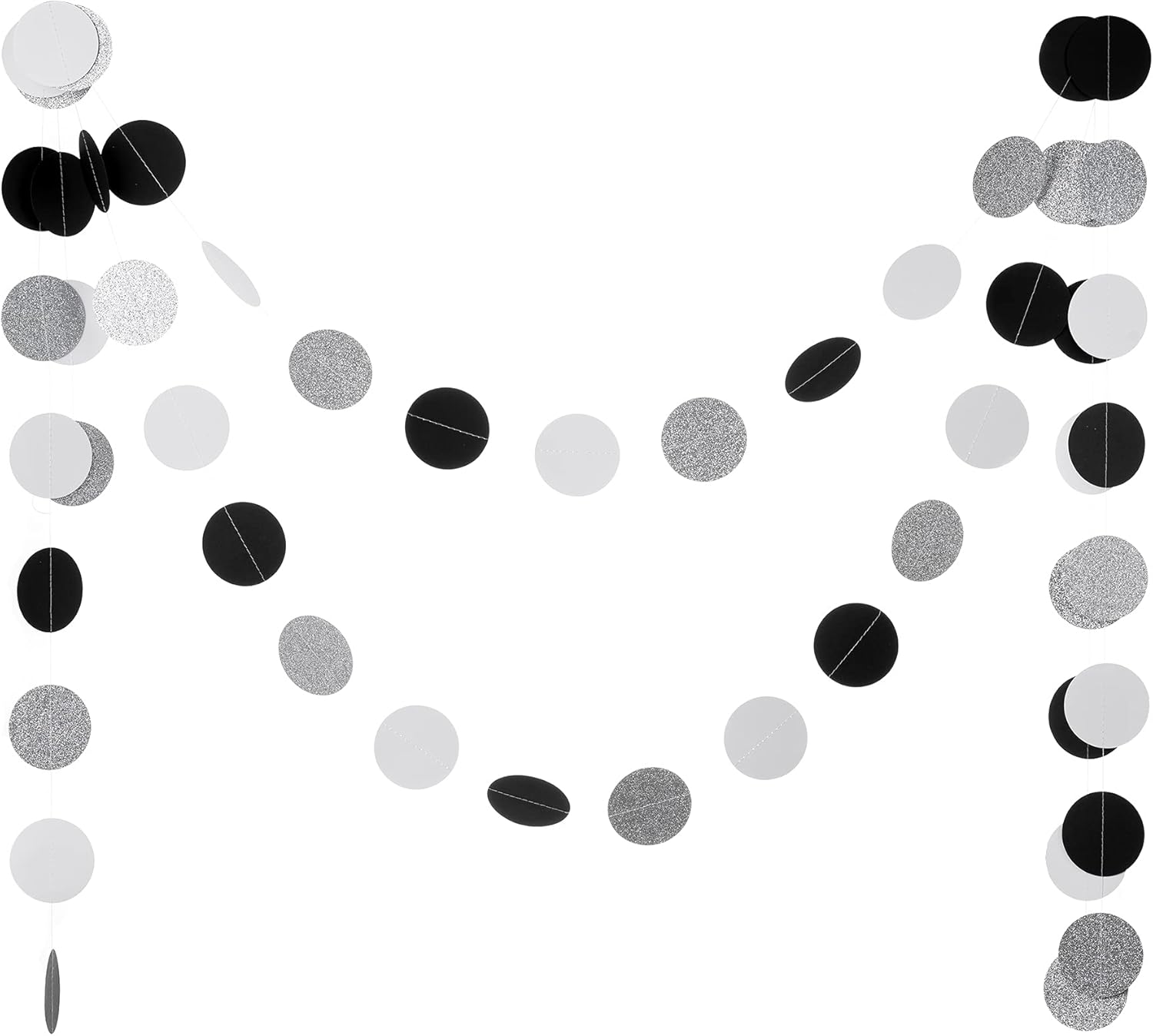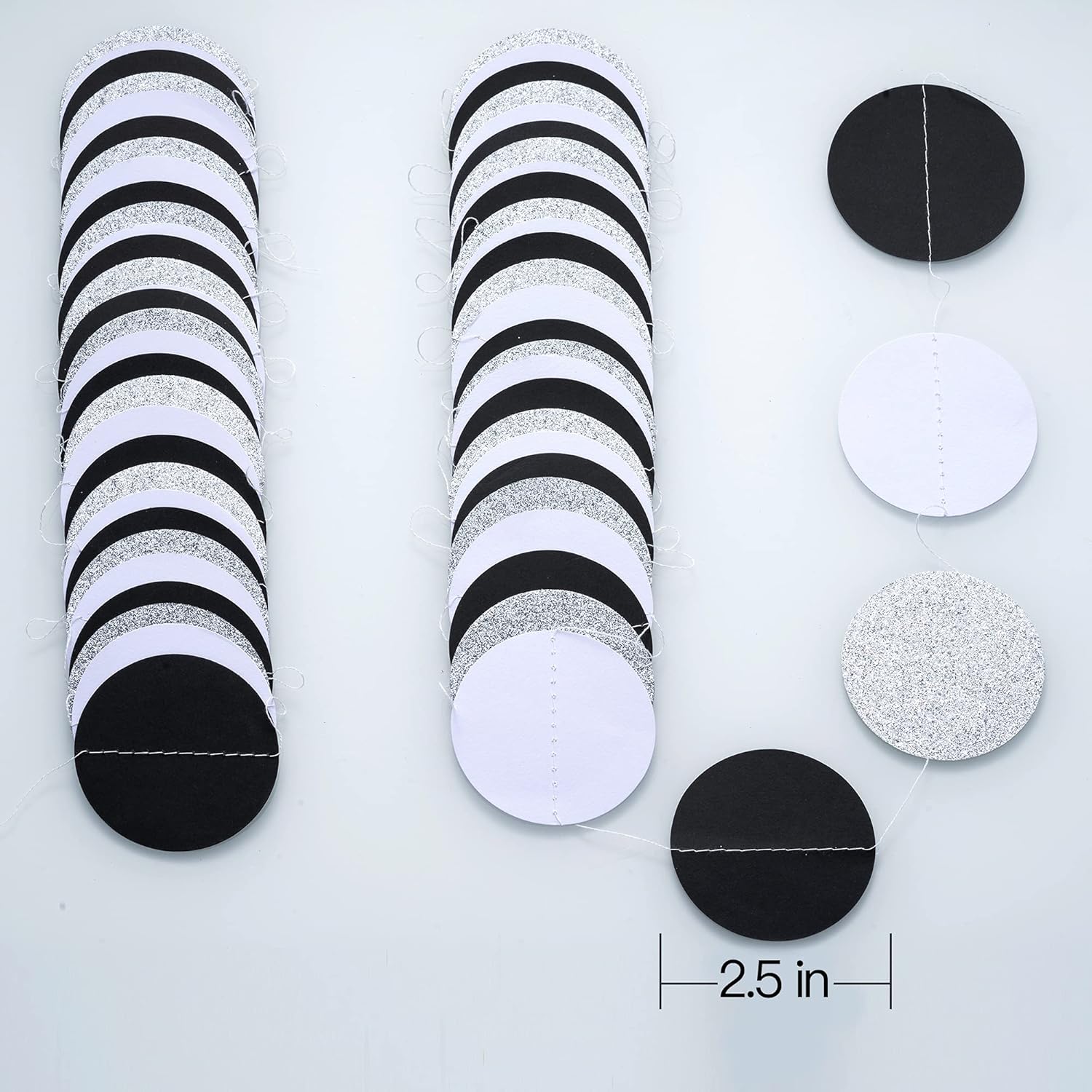 Black White Silver Glitter Paper Garland Circle Dot Streamer Banner for Graduation Bridal Shower Wedding Birthday Party Decorations, 2.5" in Diameter, 20 Feet in Total
