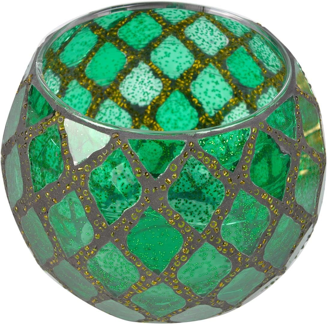 - VOTIVE TEALIGHT CANDLE HOLDER - Size: 4.1"x 3.2". This candle holder features a beautiful mosaic design with vibrant blue, green, and yellow glass pieces, creating a mesmerizing light display when a candle is lit