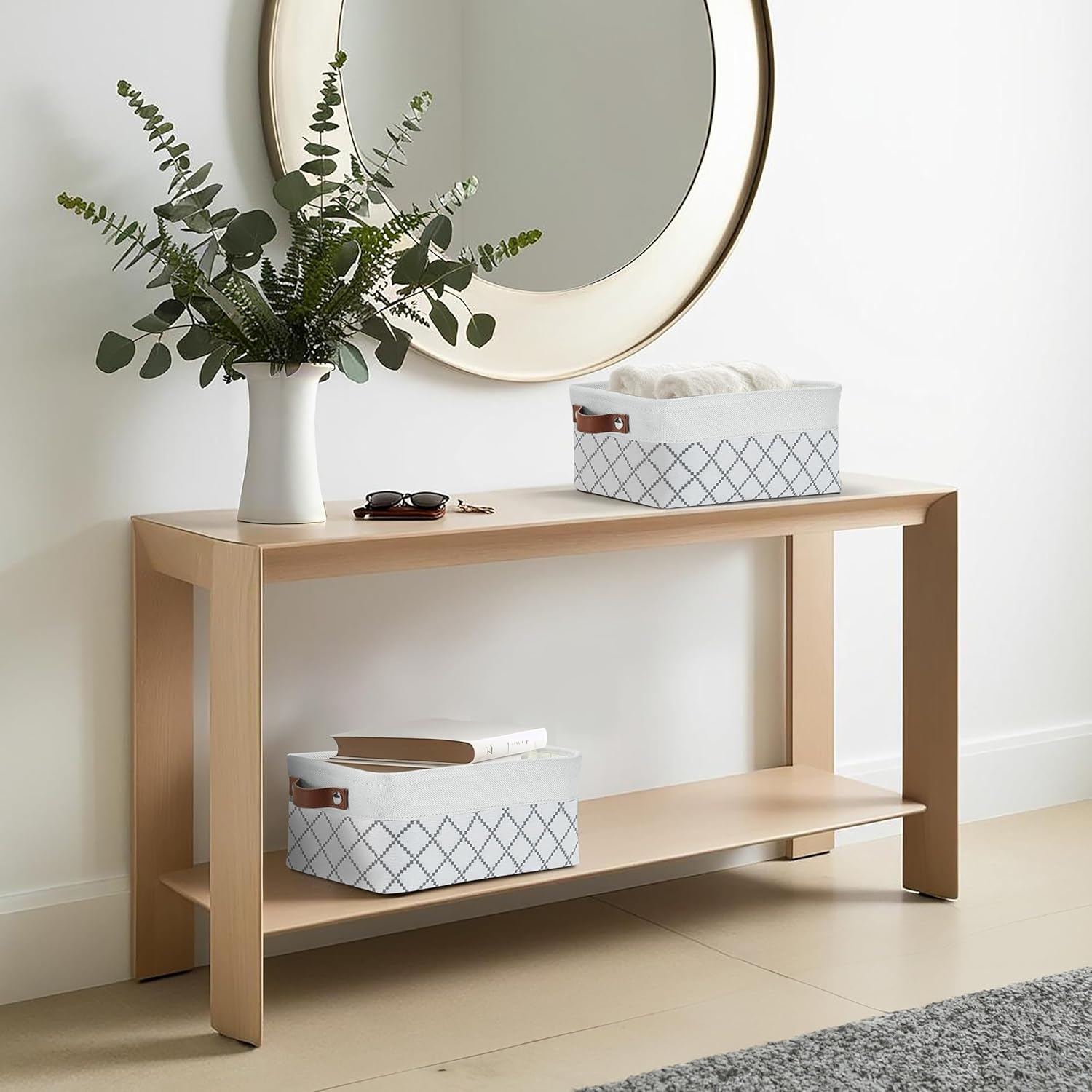 - Durable Design: DECOMOMO's baskets feature a sturdy metal frame, extra thick EVA exterior, polyester interior, 2.5mm MDF fiberboard bottom, and faux leather handles capable of holding up to 15 lbs.