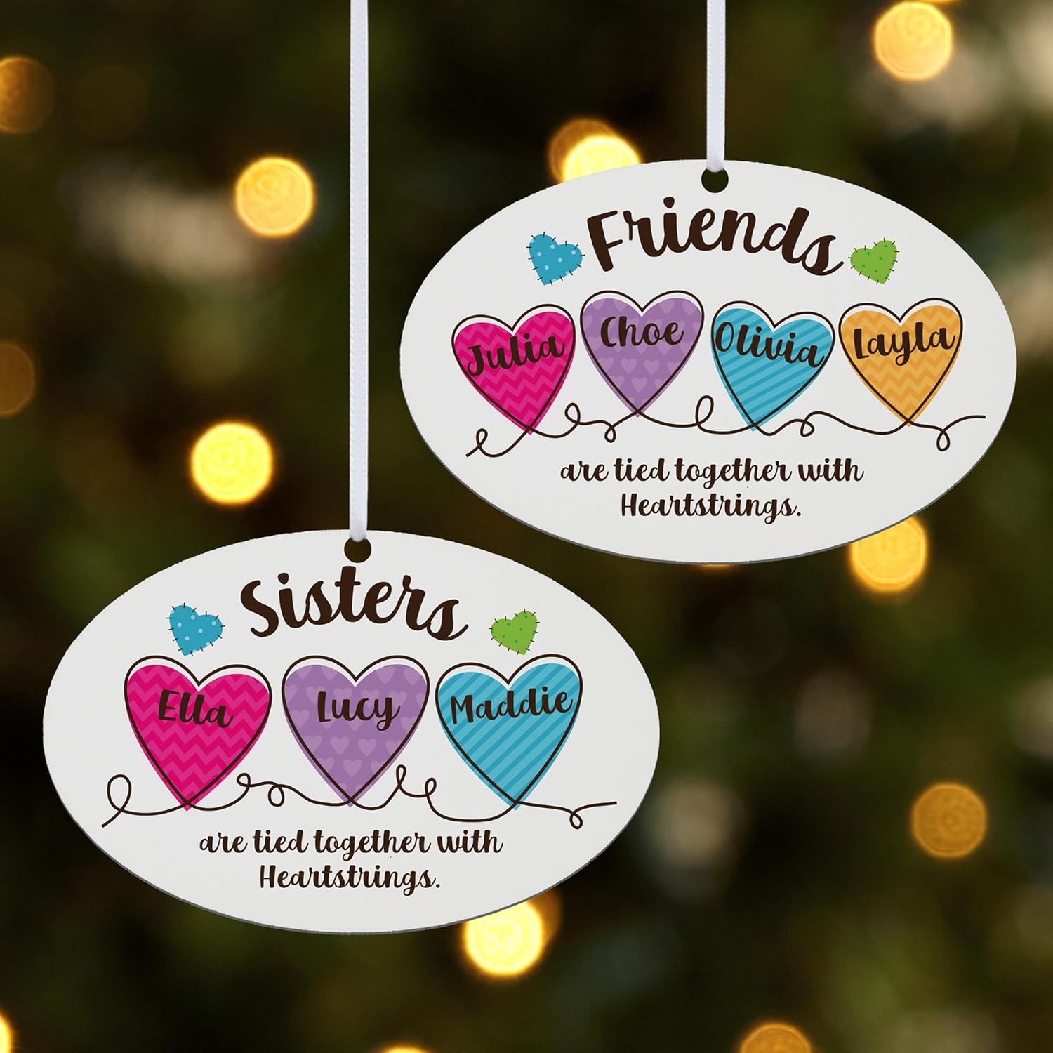 - UNIQUELY PERSONALIZED: Choose Sisters or Friends design. Customize your pastel ornament with any 2–6 names up to 12 characters each—letters or numbers. The sentiment "are tied together with Heartstrings" always appears.