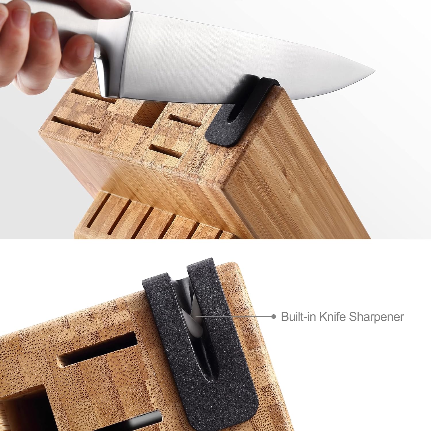 - EASY TO STORAGE - All knives store safely in the knife block with built-in sharpener for space efficient storage. The block is self-sharpening, which is effective and keeps the knives razor sharp.