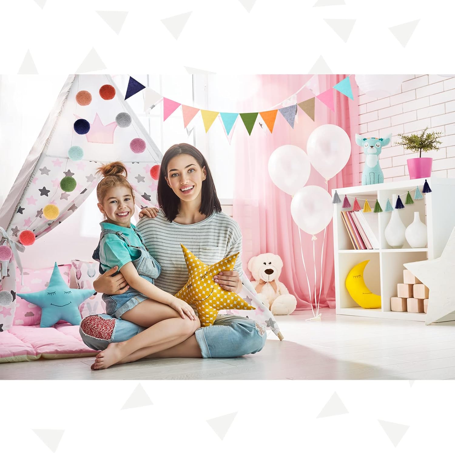 - Nice decoration set: the pom pom garland looks elegant and cute when hung on the wall or as backdrop decorations, easy to hang on the ceilings, walls as party or home decoration; Each garland consists of 10 pieces of tassels and each tassel contains multiple colors, full of warm and sweet feelings; The pennant banner cutting is neat, will not easily fall off or break, durable and reusable