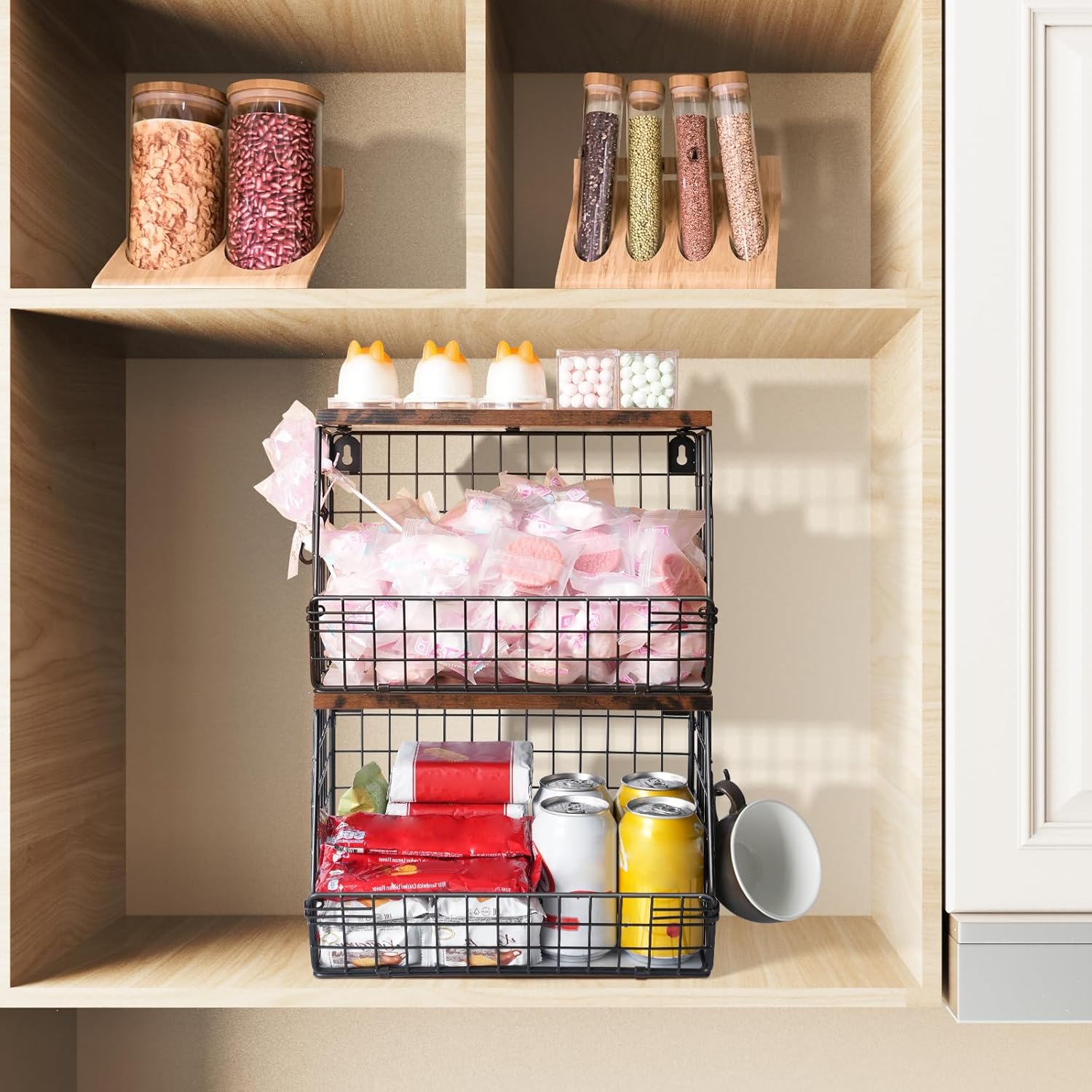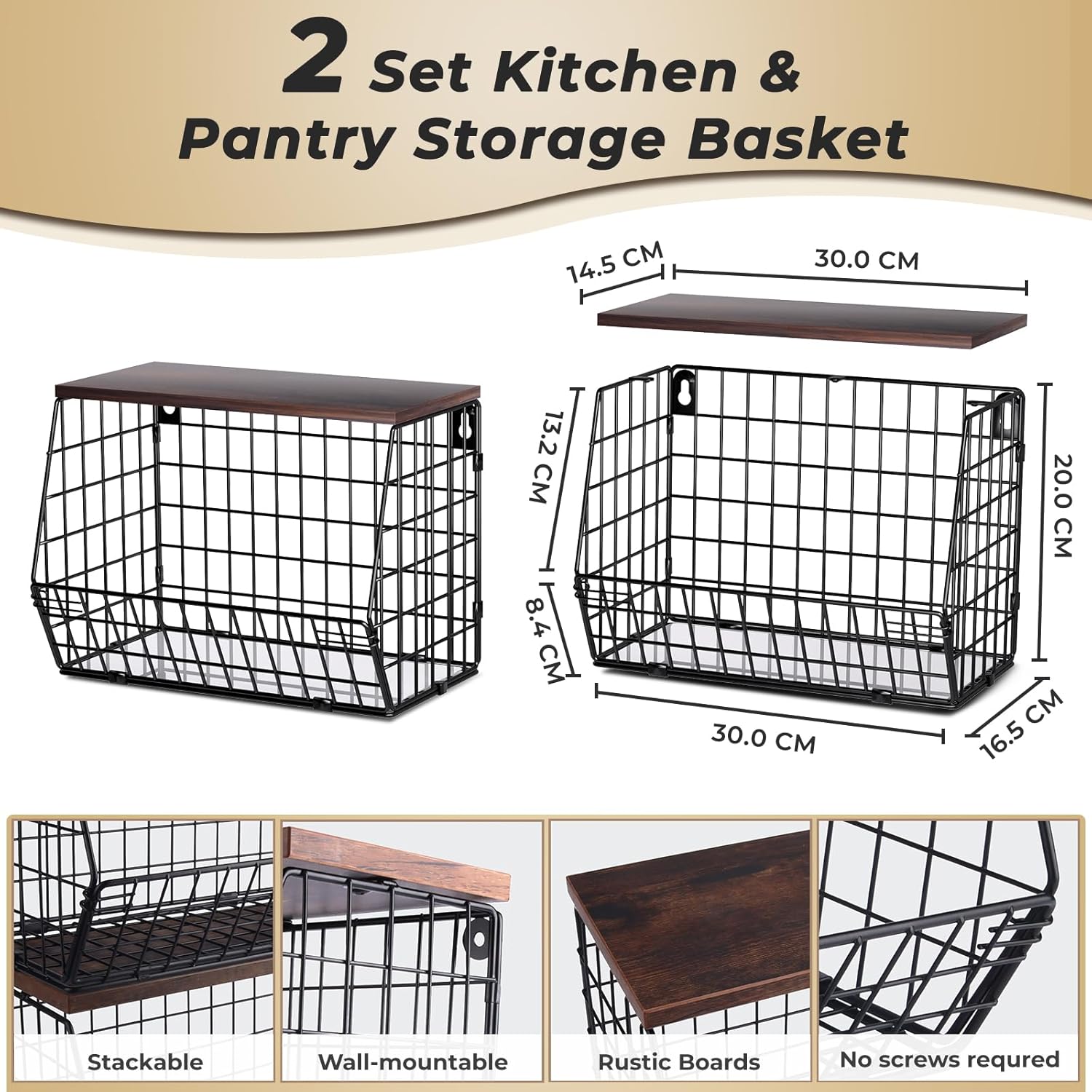 - Stackable & Wall-mounted Metal Basket: Our hanging basket not only can stackable or countertop tiered use, but also can hang in the wall to maximize save your space. Storage baskets wood lid top add more storage room to put some small things like seasoning jar, magazine, office supplies, toiletries for bathroom etc