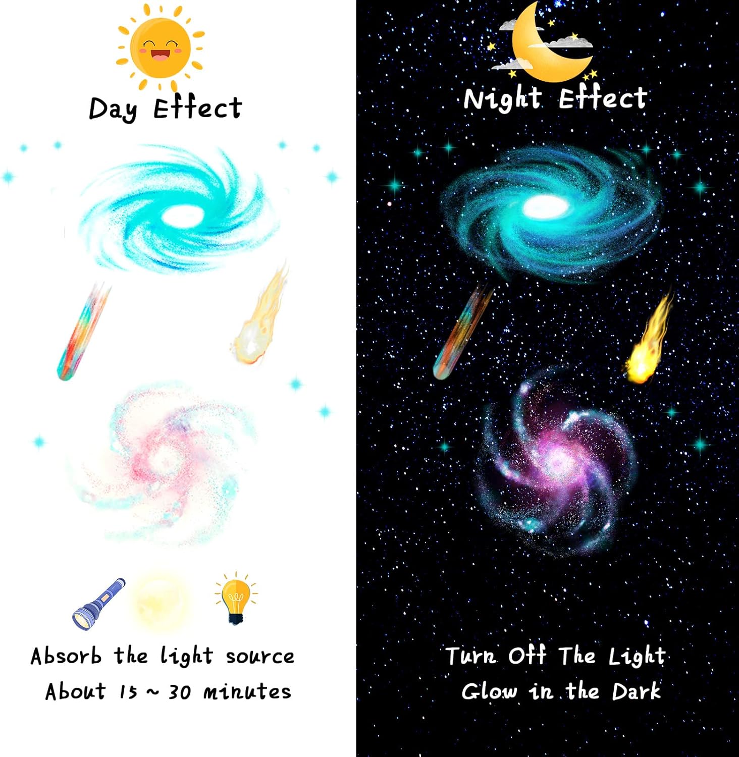 - Glow in the dark: after absorbing the light for 15-30 minutes, these glow in the dark star decals would shine in the darkness automatically, light your universe and let your immerse in the quiet and ease atmosphere; Nice tools to lull children to fall asleep