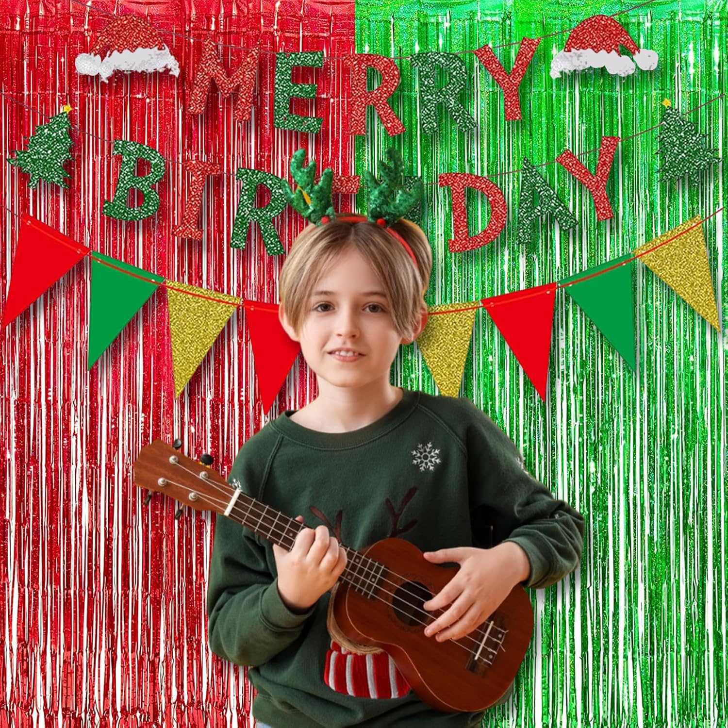 BRAVESHINE Tinsel Foil Fringe Curtains - 2 Pack 3.2 x 8.2 ft Metallic Photo Booth Streamer Backdrops for Birthdays Fiestas Melons Hawaiian Luau Tropical-Theme Christmas Party Decorations - Red Green