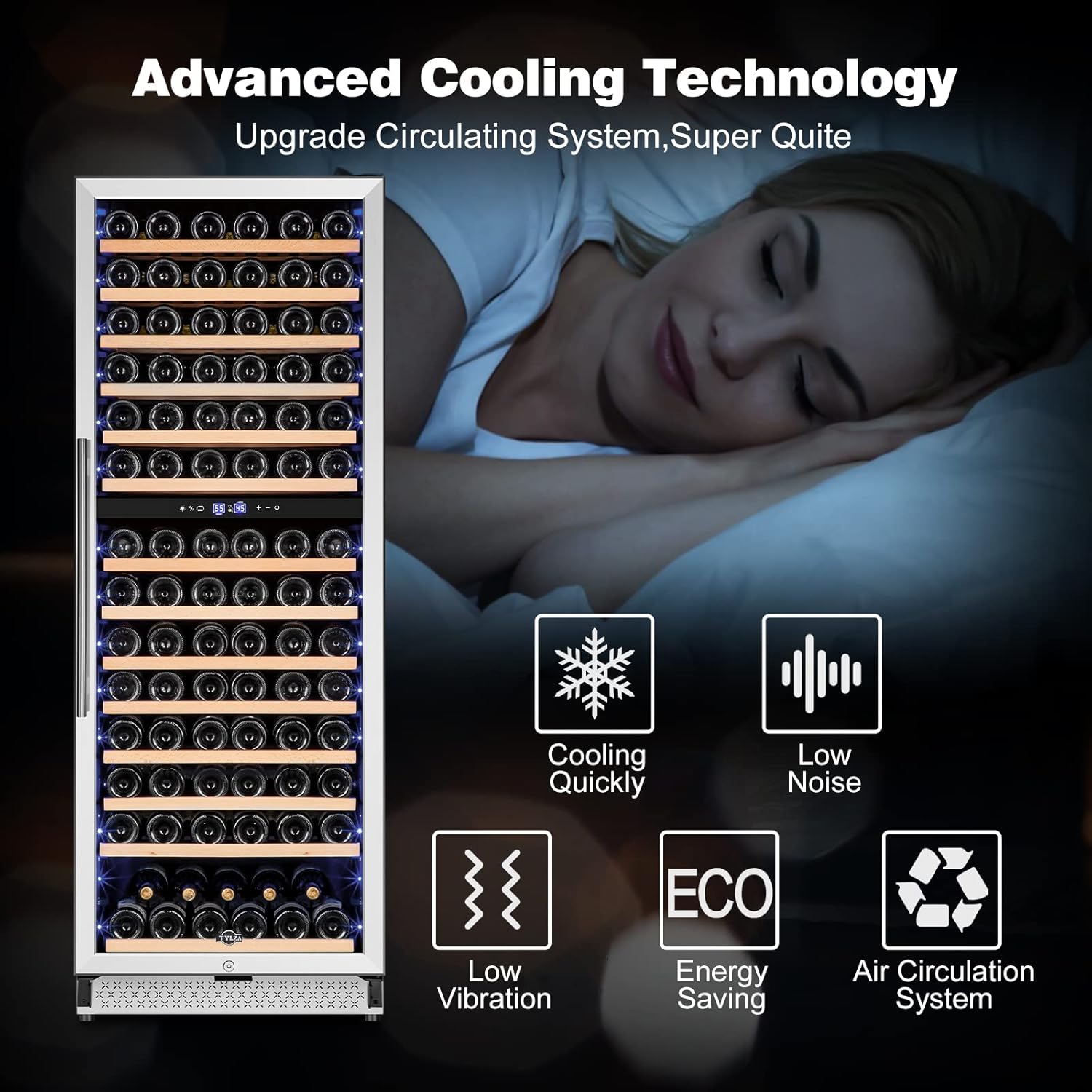 - 180 Bottles Large Capacity:The 24'' dual zone wine fridge features 14 beech wooden shelves that can store up to 180 bottles of standard Bordeaux (750 ml) wine and the bottom shelf has large capacity that you can load large bottles;Durable beech wooden shelves No shake No damage bottle when sliding in or out;
