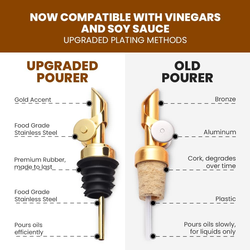 - VERSATILE KITCHEN ESSENTIAL: Elevate your kitchen with MoliMoli's olive oil and vinegar dispenser bottle set. Ideal for Oils, Vinegars and Syrups, ensuring a neat and spill-free pour. NOTICE: For Vinegars and soy sauce, Please choose the silver spouts only! "