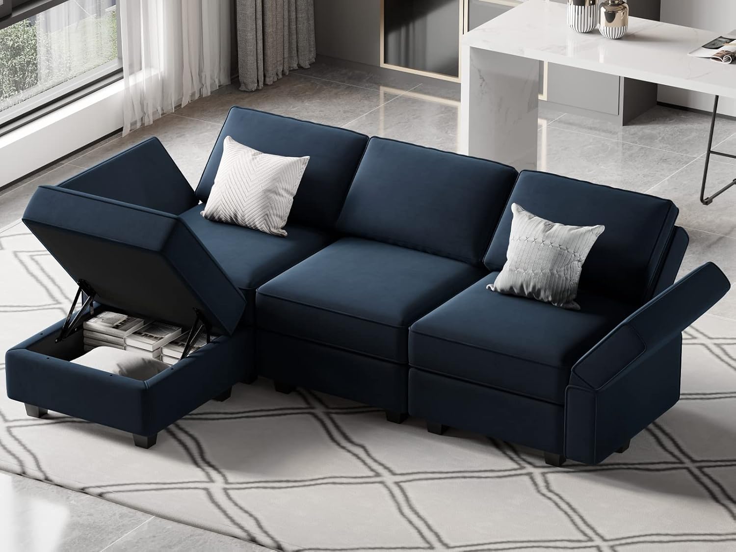 - Bonus Storage Space: The storage seat can work as an ottoman, a table, even a big storage as needed. You can place the magazine, VCDs and other idle items. This bonus storage space of the modular sectional sofa will save room spaces and complement the existing interior design.