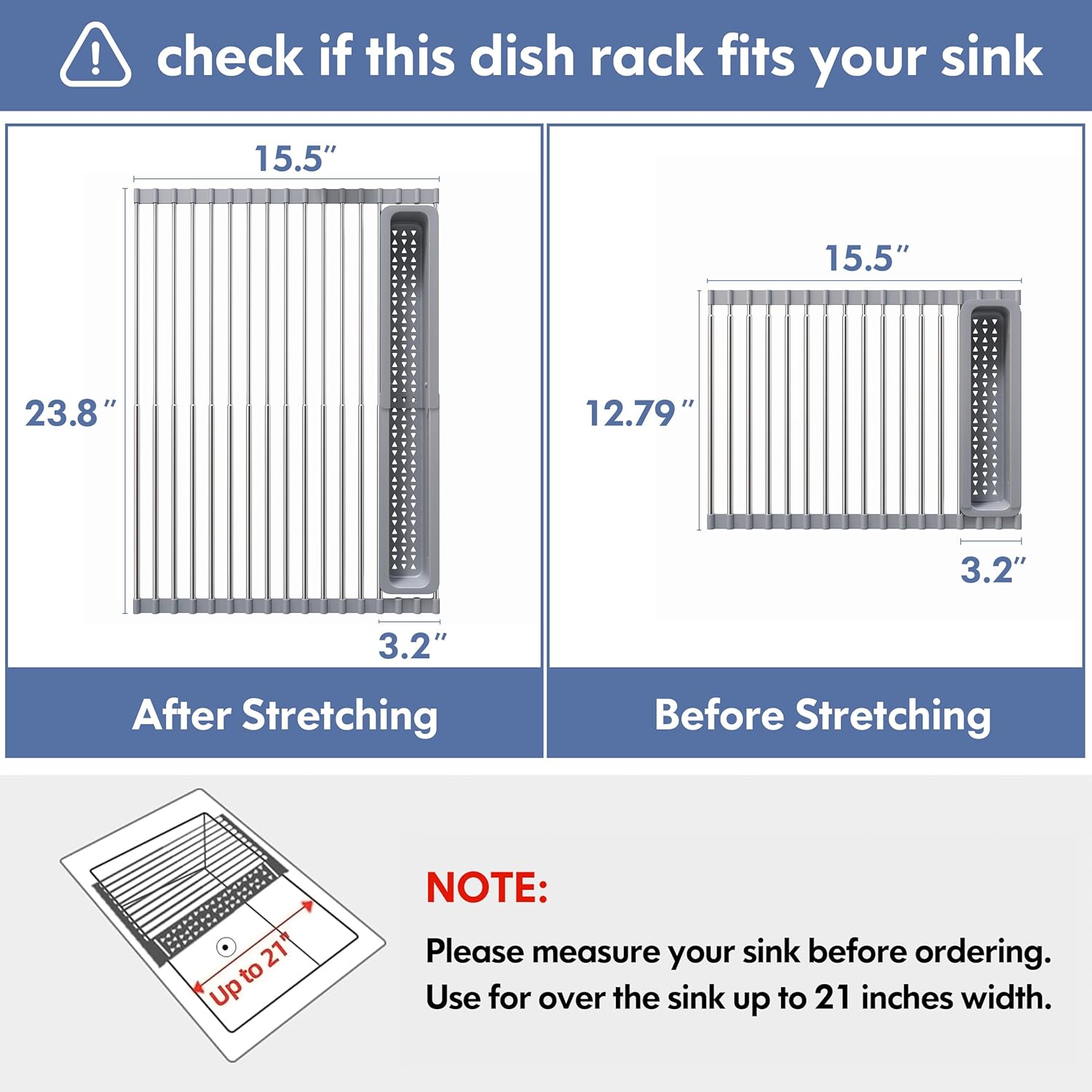 - Promise Me Measure Your Sink Size Before Purchase: Its size is x 12.8 - 23.8(D) x 15.5(W) inches, if your sink is wider than 21", this over sink dish rack may not be right for you. NOTE: Before using, please expandable the length of dish rack to fit your sink