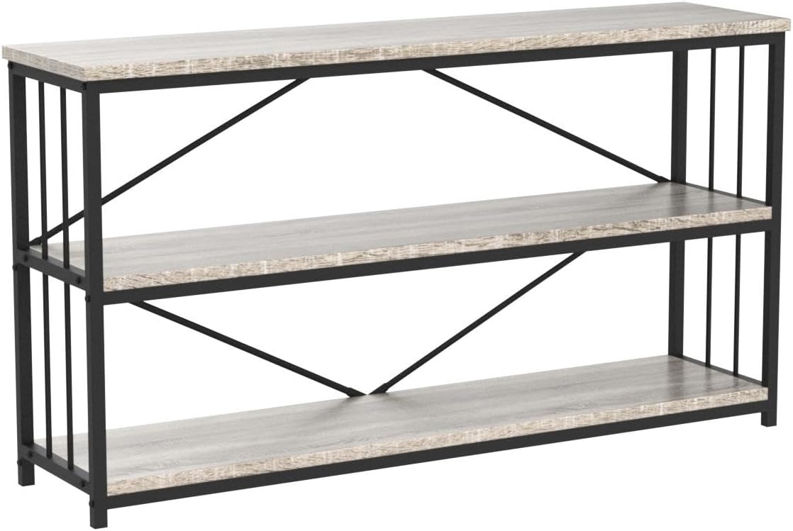 LVB Farmhouse Industrial Console Table, Wood Metal Foyer Entryway Sofa Tables with Storage, 3 Tier Long Rustic Entry Table TV Stand with Shelves for Home Living Room Hallway, Light Grey Oak, 55 Inch
