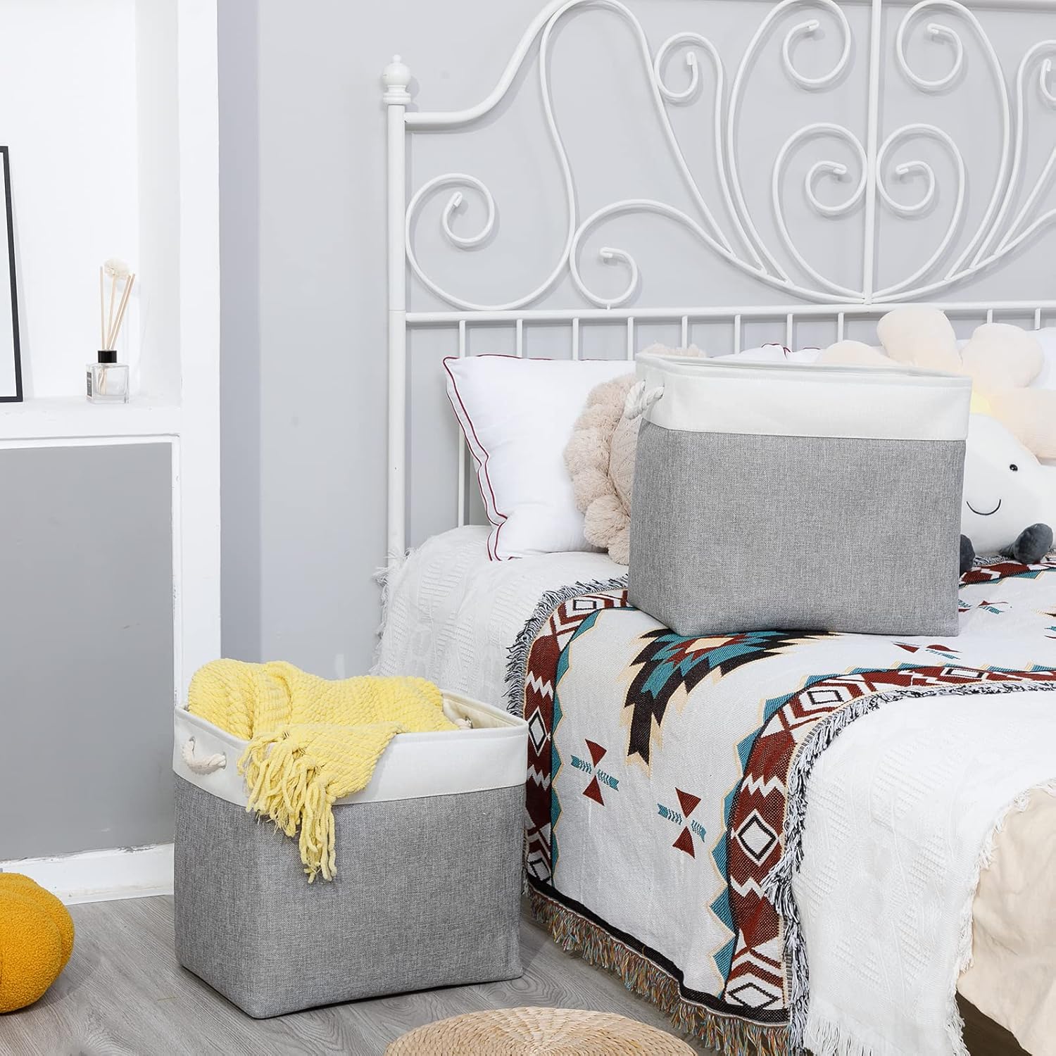 - [2-Pack Extra Large Storage Baskets] The size of each fabric storage basket is 17x12x15 inches. Large capacity allows you to store more clothes, toys or other sundries. Made of thick fabric and 2.5mm EVA. canvas storage bins for home storage are reinforced by the upper metal support frame to maintain high structural integrity. With good abrasion resistance