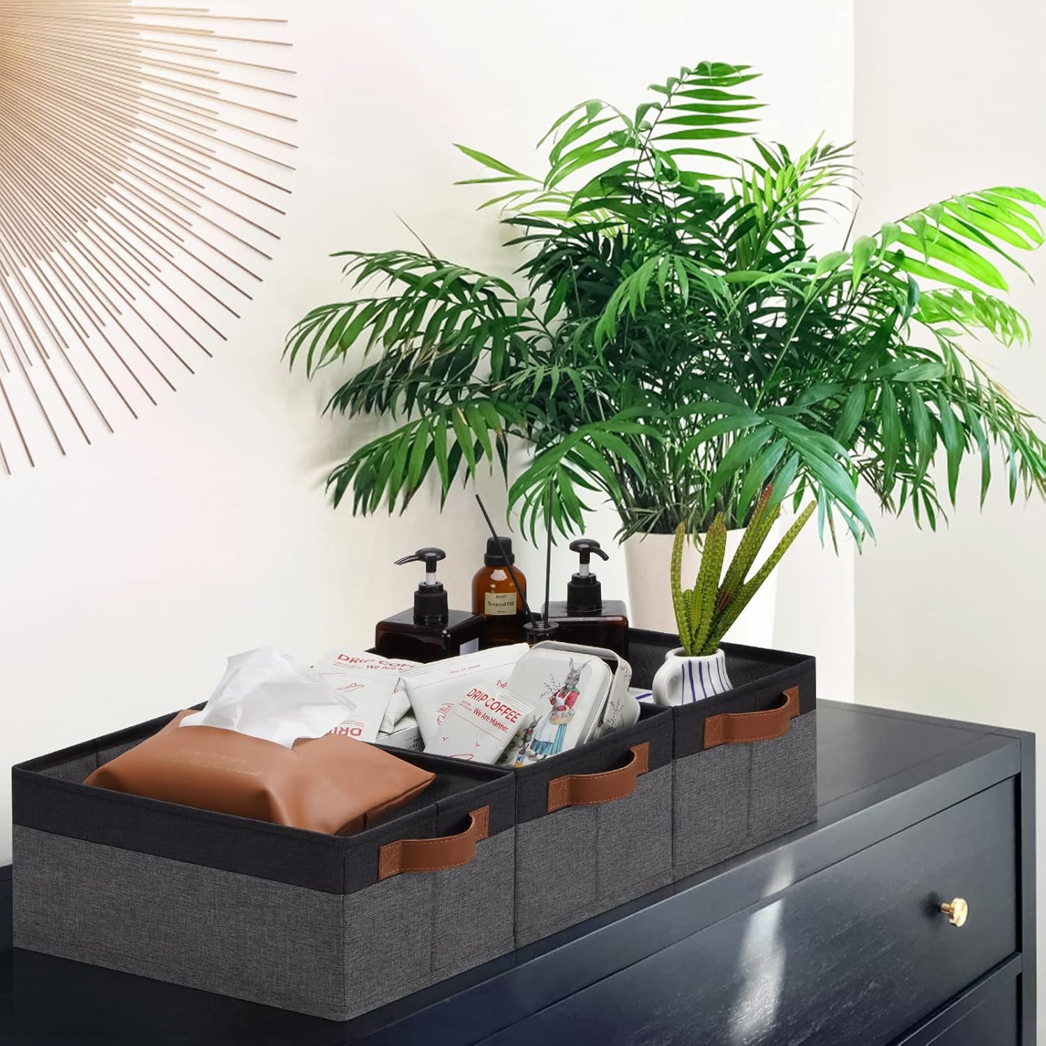 - 【FOLDABLE STORAGE BASKET】The collapsible and lightweight baskets for organizing allows you to easily place it when not in use, just by pulling out the stiff bottom cardboard, saving space when not in use or transportation. They are quite easy to assemble, place the stiff bottom cardboard inside and it's ready