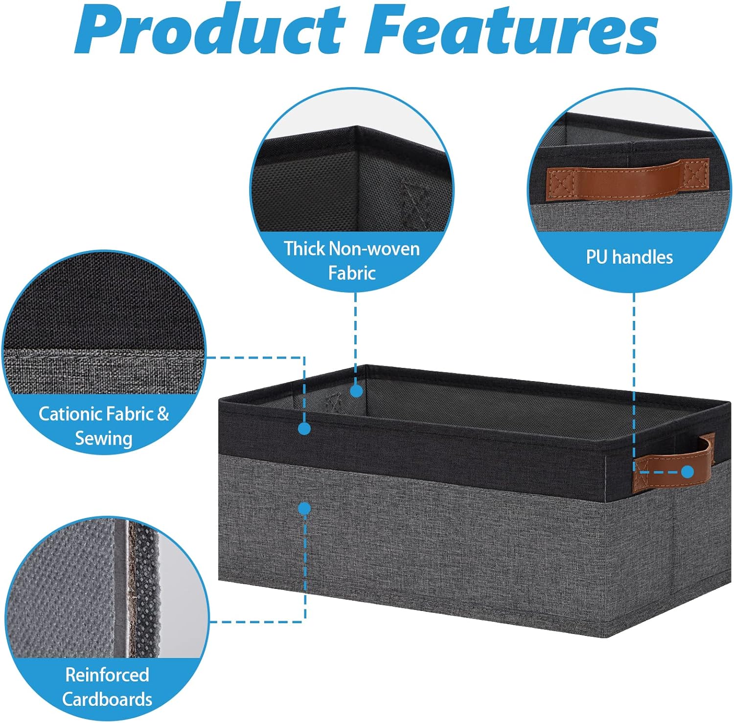 - 【QUALITY MATERIAL】Storage baskets for shelves are made of high-quality cationic fabric and polyester cotton fabric, and the inner layer is made of non-woven fabric, which is odorless, long-lasting and strong. Classic faux leather handles that adds a comfortable touch and provides a strong and comfort grip to pull and move. Fabric storage bin is easy to clean, just wipe with a damp sponge or cloth