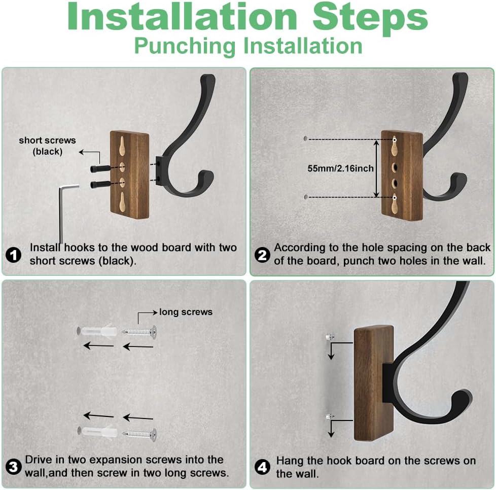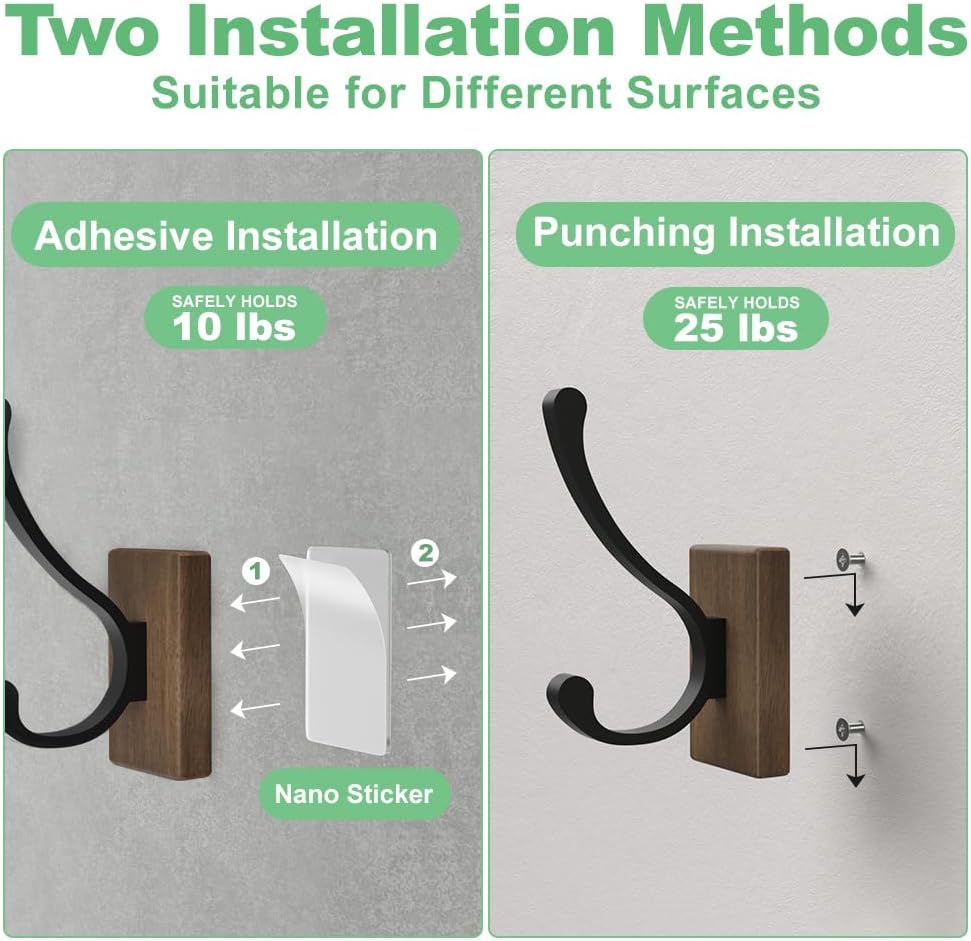 - Easy to Install: Coat hooks wall mounted, super easy to install. Just drill / install wall anchors / install screws and twist on the wall. Or you can choose to paste installation according to your needs, which saves time and effort. (mounting accessories are all included).