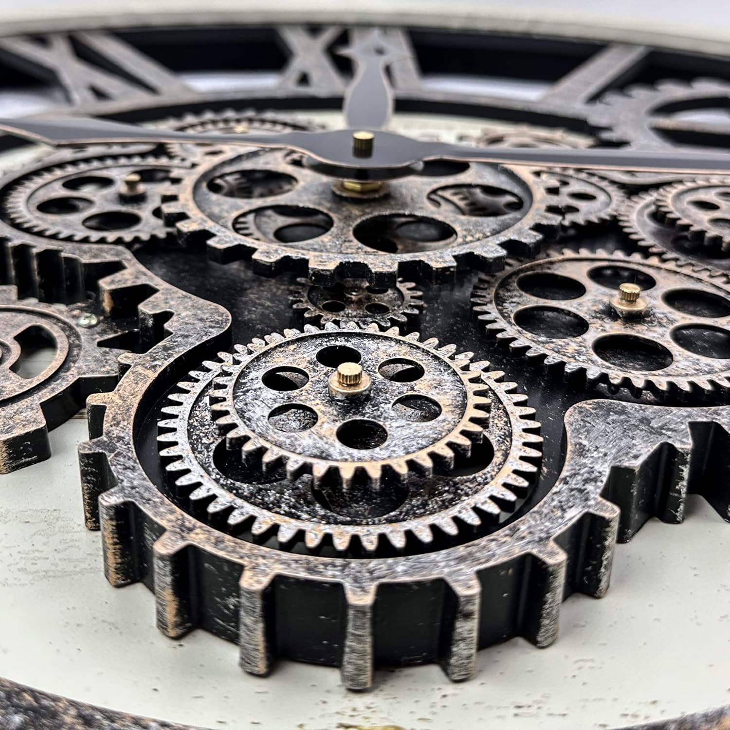 - ăReal Moving Gear ClockăAll gears for the wall clock are real moving! Design with rustic bronze-color and industrial style. An creative combination of four gears for a retro look, has a very exquisite decorative effect makes the wall clock become a chic art works. The large wall clock crafted of nature wood & MDF. Big roman numeral numbers and wood rustic moving gears perfect for any room decor.