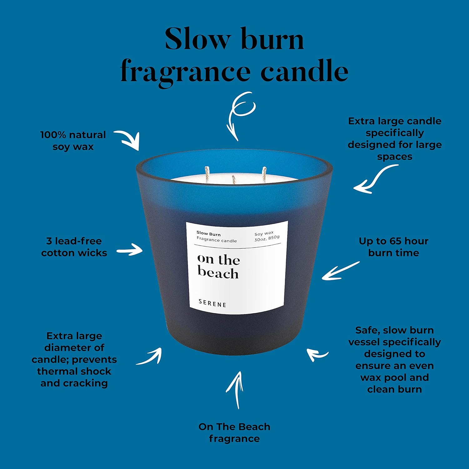 Hidden Label Large Scented Candle, On The Beach, 30oz 3 Wick Huge Candle, Serene Collection Slow Burn Natural Soy Candles for Home Scented