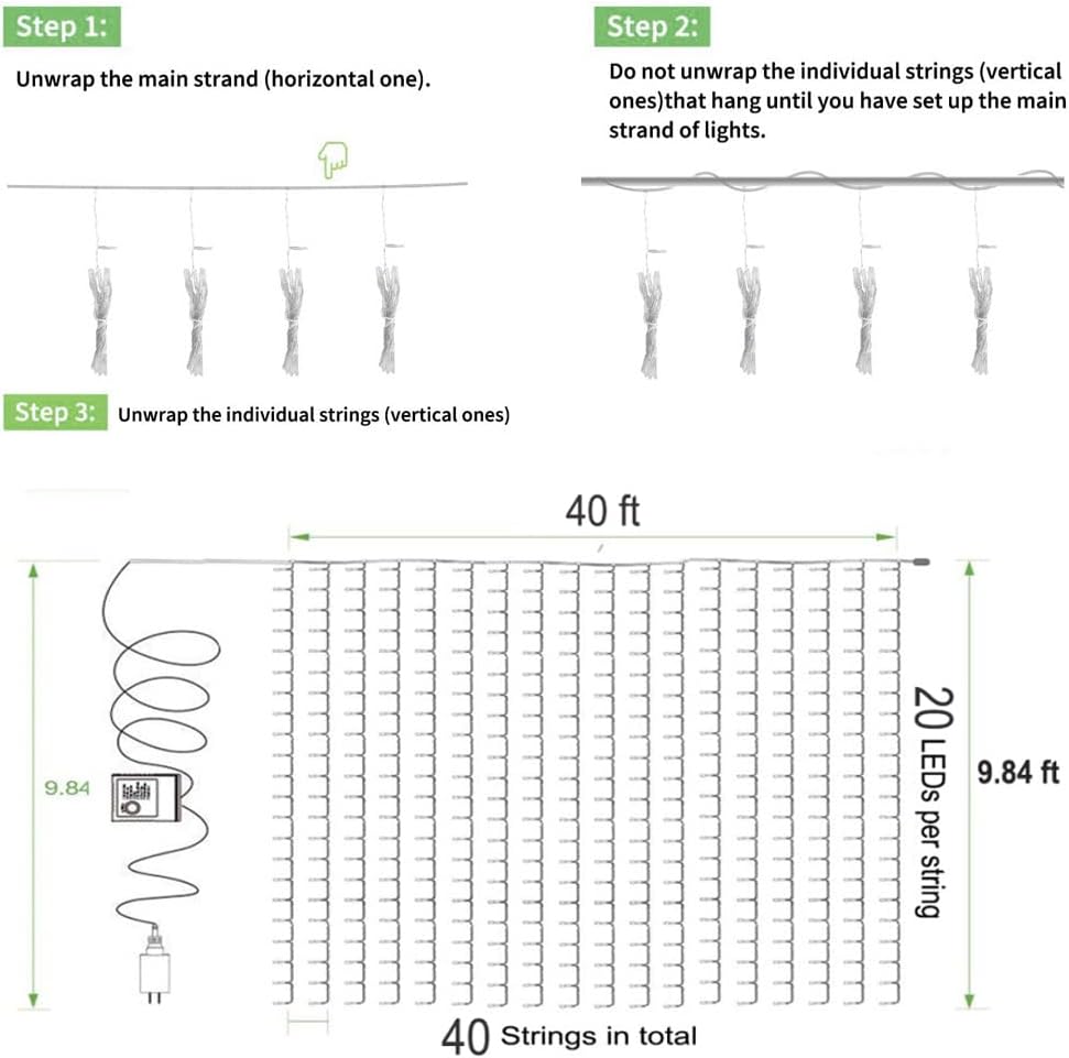 - [40 ft x 10 ft Curtain Lights] Boasting 800 LED lights, 4-5 times wider than others, making it ideal for outdoor decor. The product has an IP44 weatherproof rating, but please ensure you protect the plug and controller, as they are not waterproof. (please Note: they are NOT connectable)