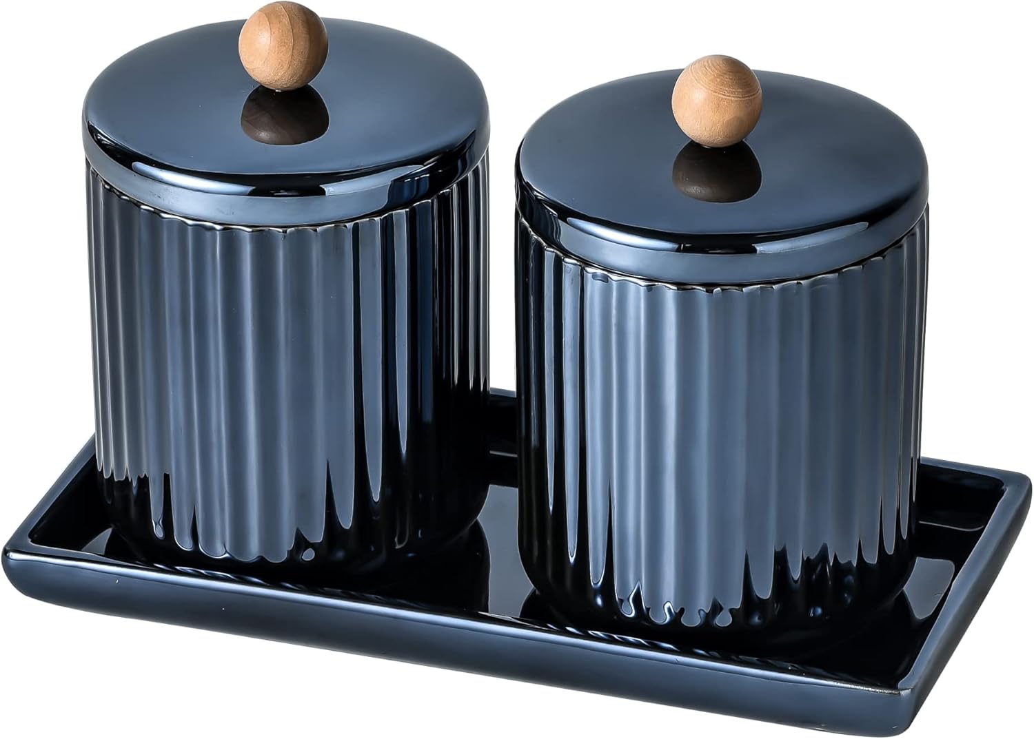 - Storage Fashion - These stylish ceramic jars and bathroom trays save space and decorate your home, stylish and organized presentation your powder room, bedrooms, bathroom,vanity organizers, shelves, entryway tablesand are also perfect for your kitchen or office,which takes very little room.