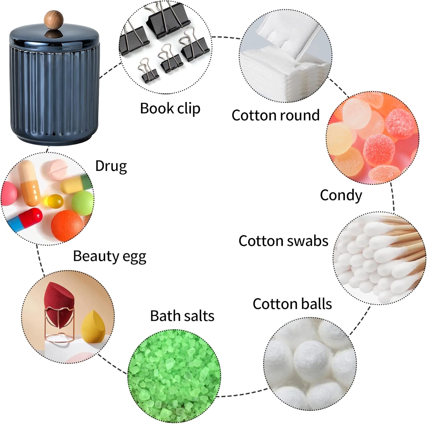 Qtip Holder Bathroom Set with Tray(3PCS) - 2 Piece 12 oz Blue Apothecary Jar Canister with Lid and 1 Pack Ceramic Vanity Tray