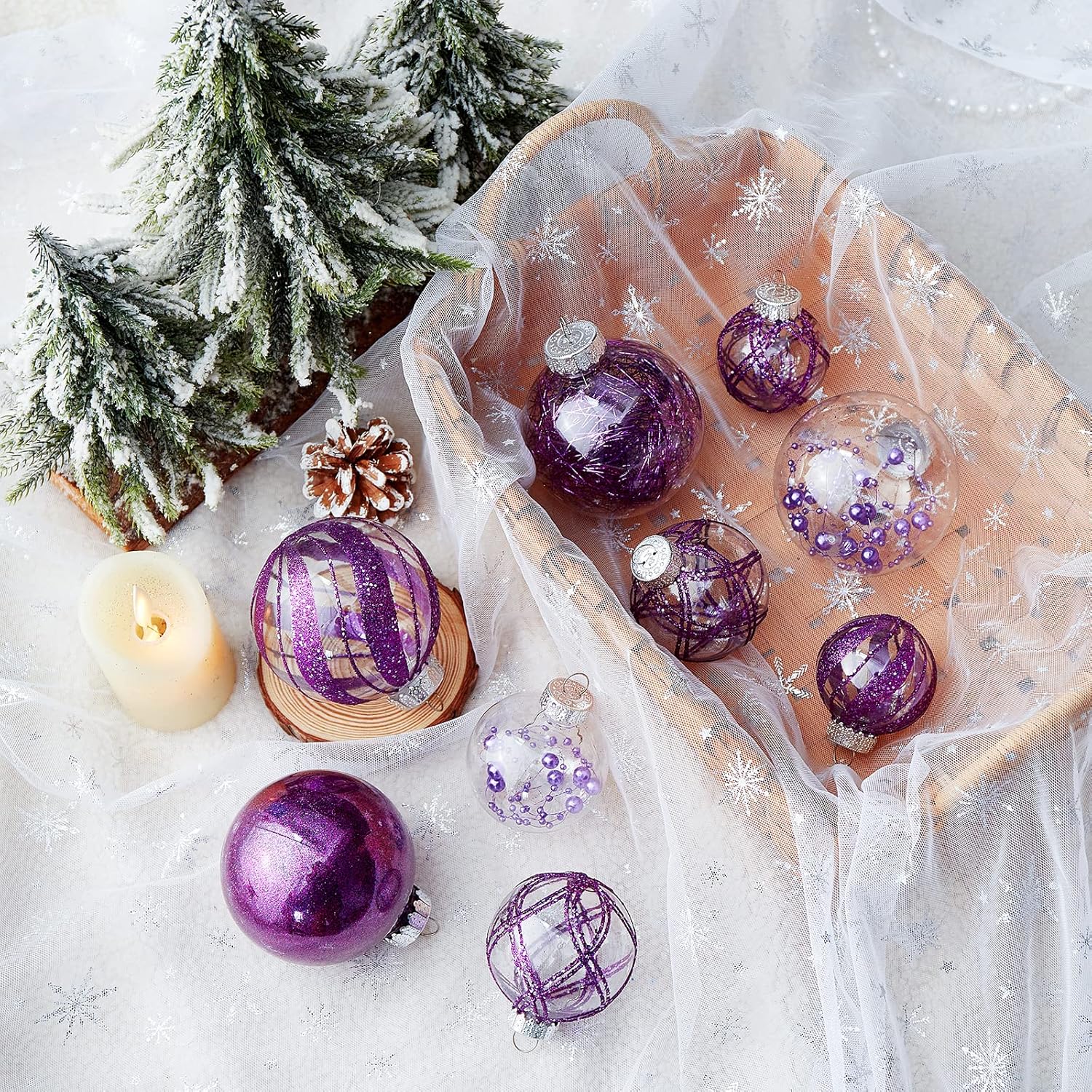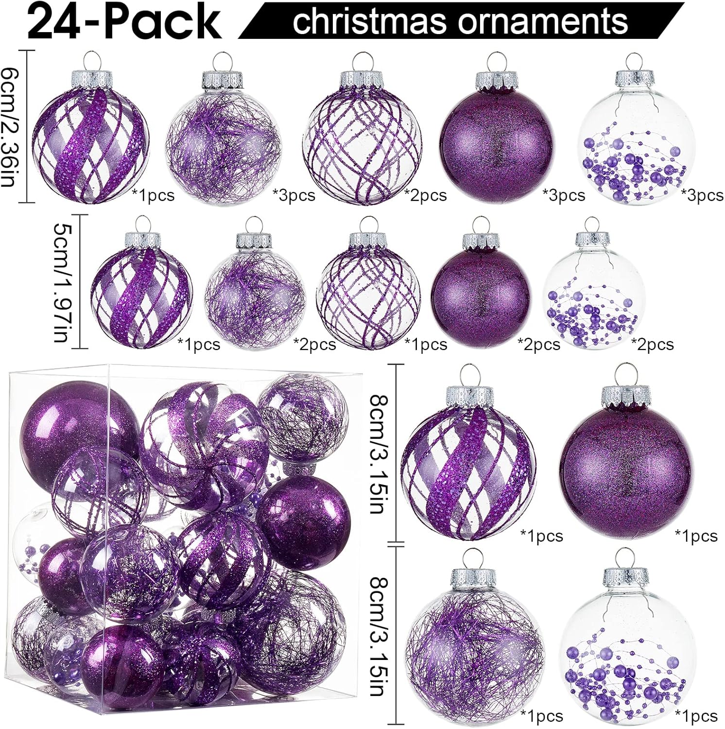 - Purple Christmas Ball Ornaments--These 24 clear Christmas decorations are made of durable and environmentally friendly plastic with excellent shatter resistance. These Christmas balls have shiny decorations and a transparent glaze base, which are perfect for hanging on your Xmas tree and decorating your Home with them,this will become part of your vacation.