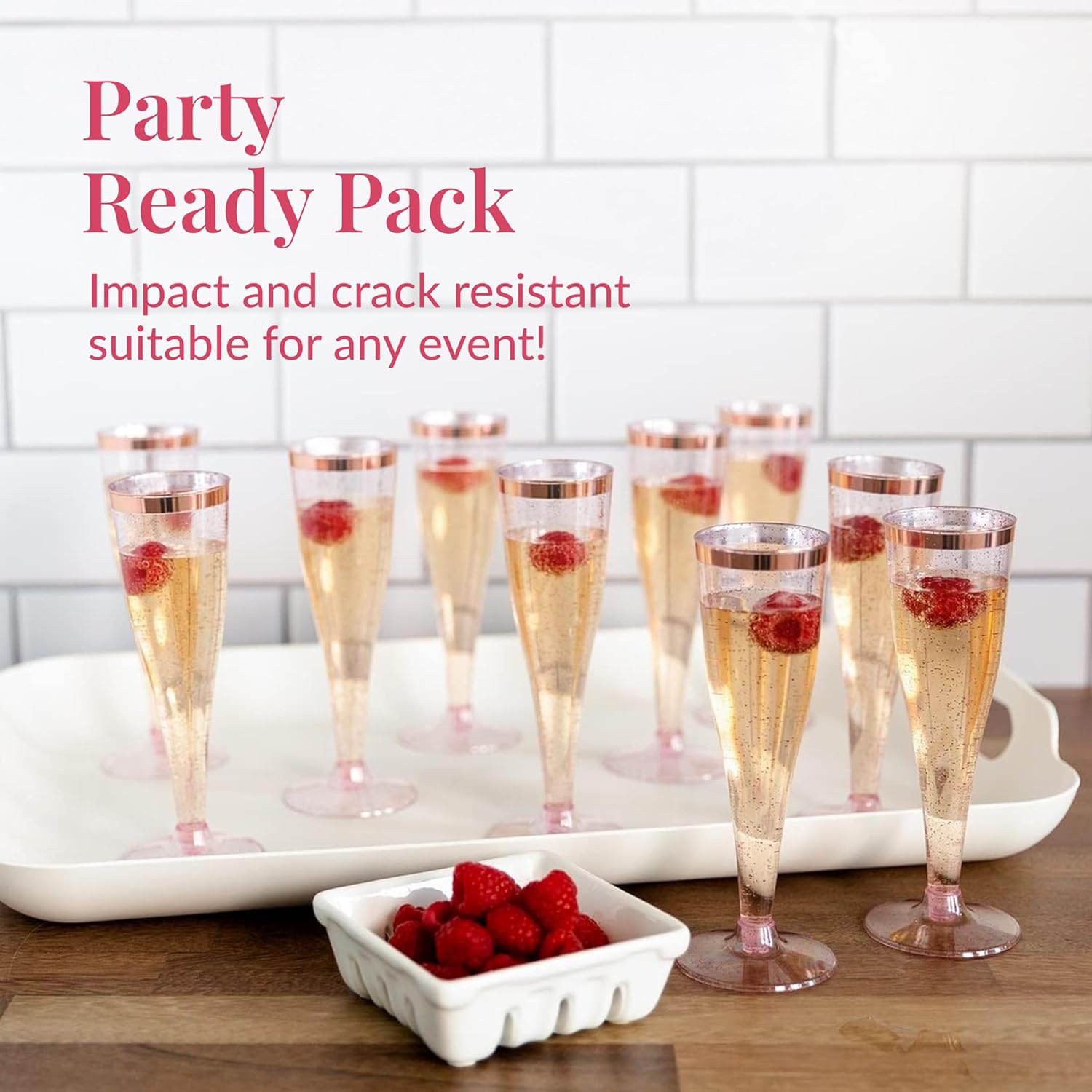 - Chic Rose Gold Party Elegance: These plastic champagne flutes with rose gold rims add style and shine to weddings, showers, or parties; the perfect pink accent for indoor or outdoor events