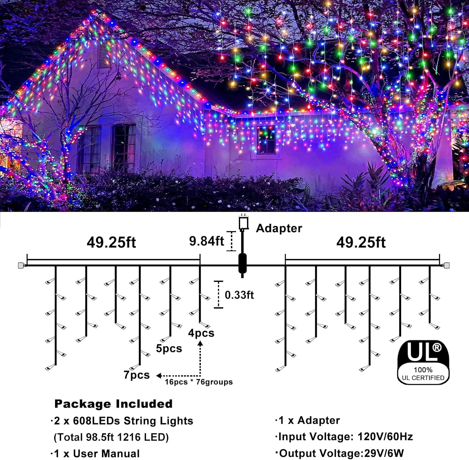 Icicle Christmas Lights, 98FT 1216 LED Icicle Lights for Outside with 228 Drops, 8 Modes Waterproof Twinkle String Lights for House Bedroom Wedding Holiday Decorations, Multicolor
