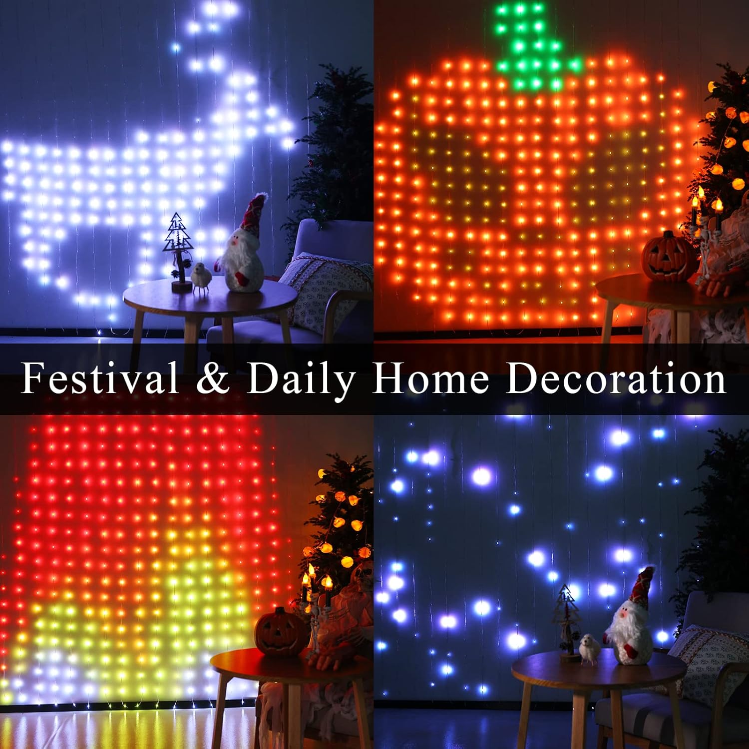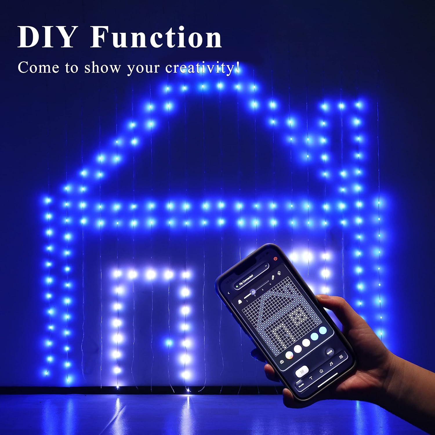 - Multiple light modes and DIY function- The lights have multiple animation options, including pumpkins, skulls, Santa Claus, Deer, Maple Leaf, the American flag, Meteor showers, snows, hearts, and other animations. It can be both daily and festival decorations. There are 12 fixed color and RGB color selection areas on the APP, you can choose colors, draw, or enter text to meet your needs of personalizing and customizing, creating unlimited ideas in the color-changing curtain lights.