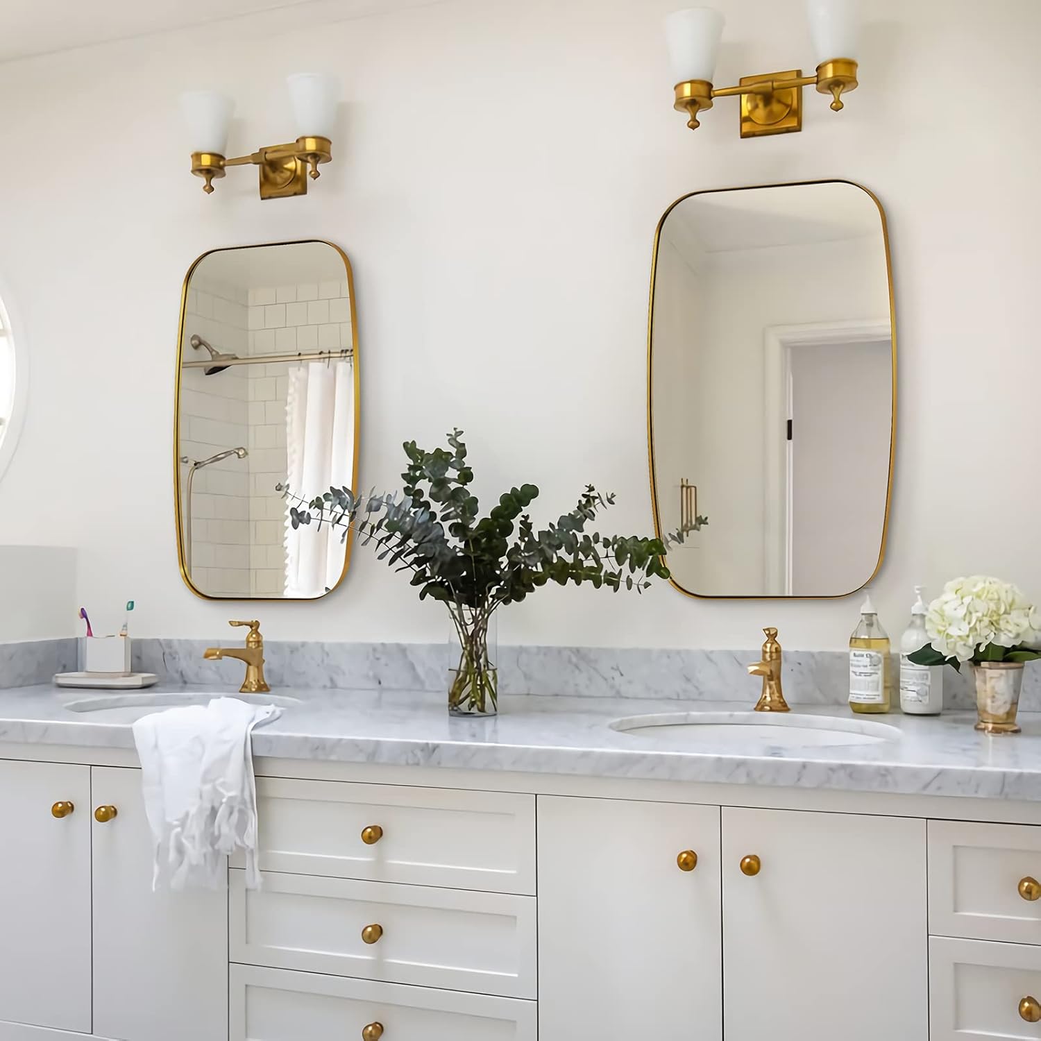 - Excellent Performance: A sleek, modern stainless steel metal frame surrounds a unique oblong mirror; sets it apart from traditional oval or rectangular mirrors; brushed gold finish complements your bathroom; adds light and space to the room