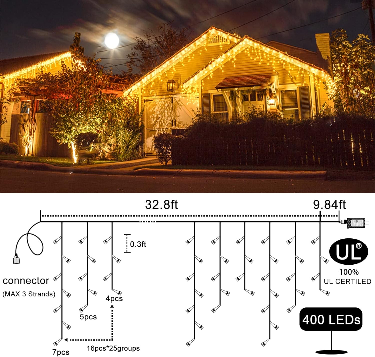 - 🔔【Waterproof&UL certified】Christmas icicle lights are IP44 waterproof, perfect for outside decoration and can work normally even in wind, rain, freezing rain, heavy snow and freezing cold temperatures. These Halloween lights are UL approved, output voltage is 29V, it's completely safe to touch. These led icicle lights are made of 100% premium copper wire and will not overheat even after prolonged use.