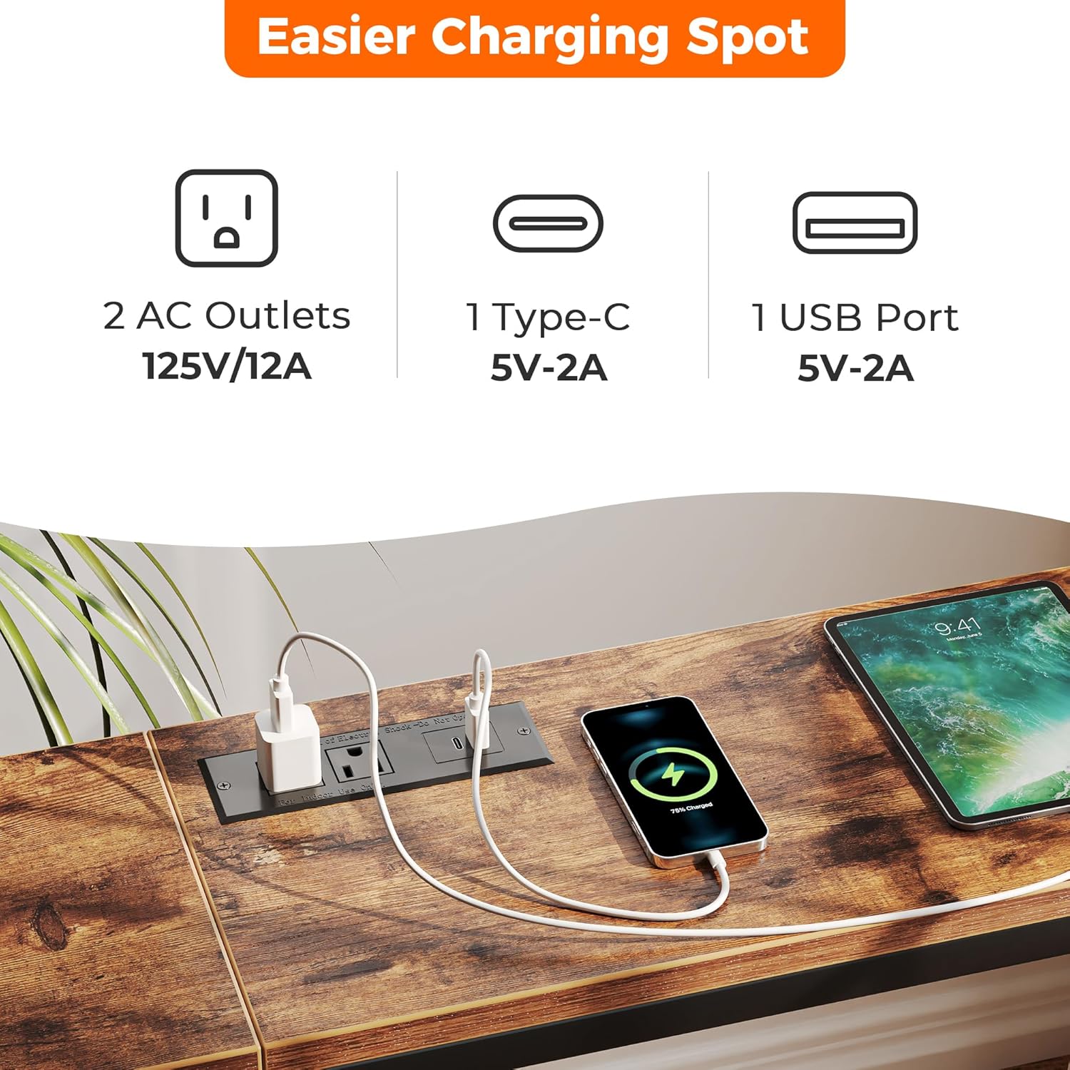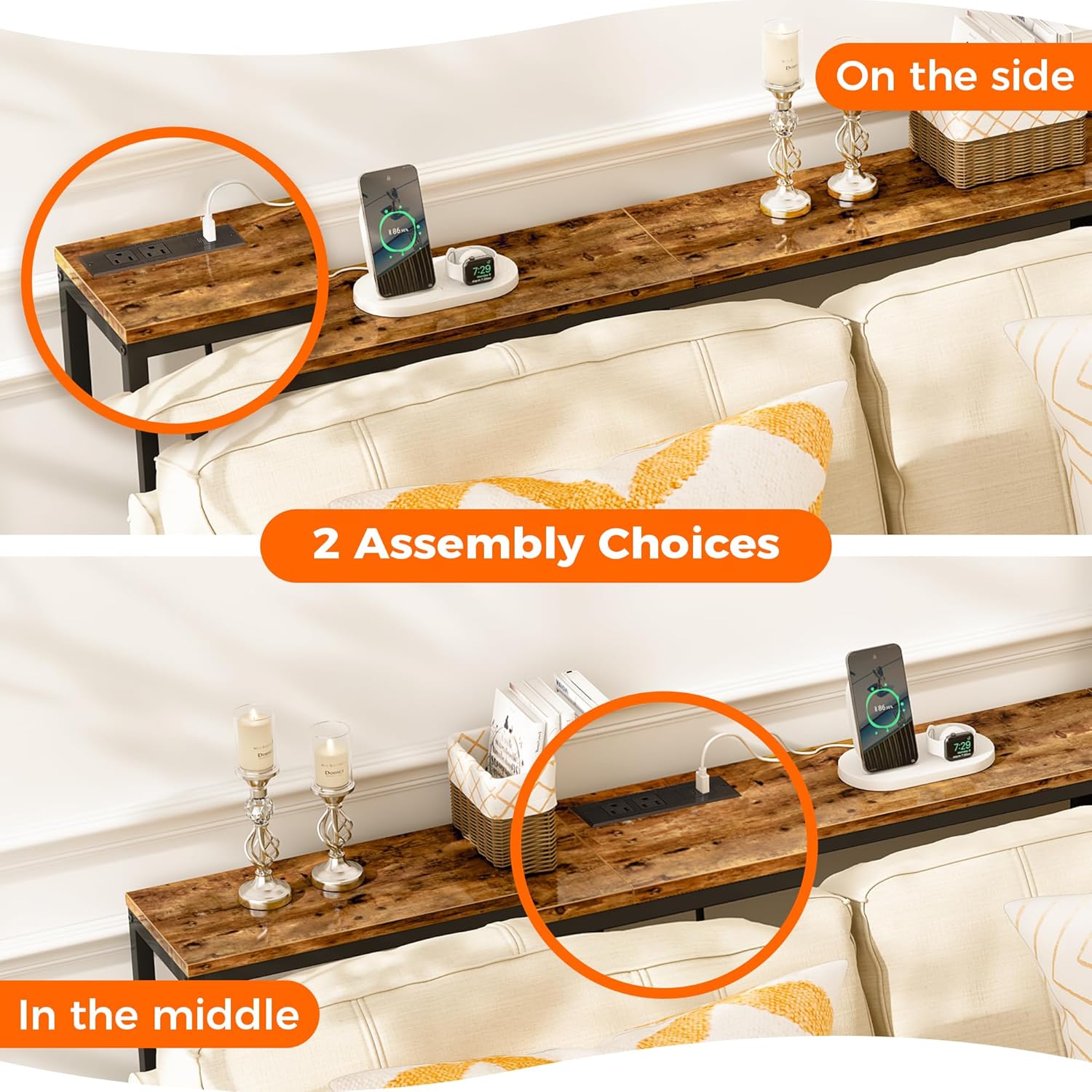 - [No Low Battery Warnings]: Imagine lounging on your sofa and brushing your phones to relax after a busy week. Don’t let low battery disappoint you. Let this sofa table narrow long with 2 AC outlets, 1 USB port and 1 Type-C Port provide close-at-hand power