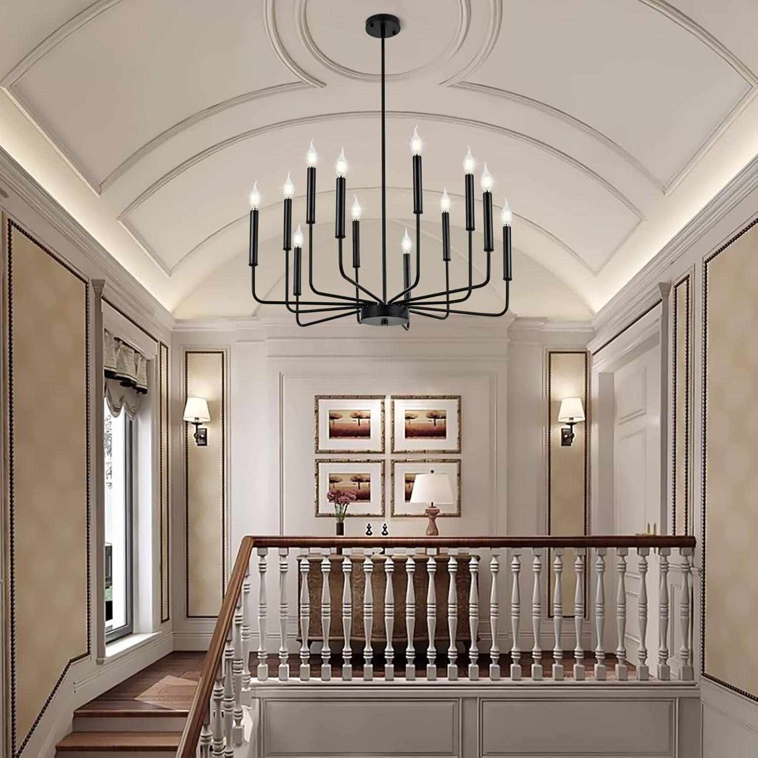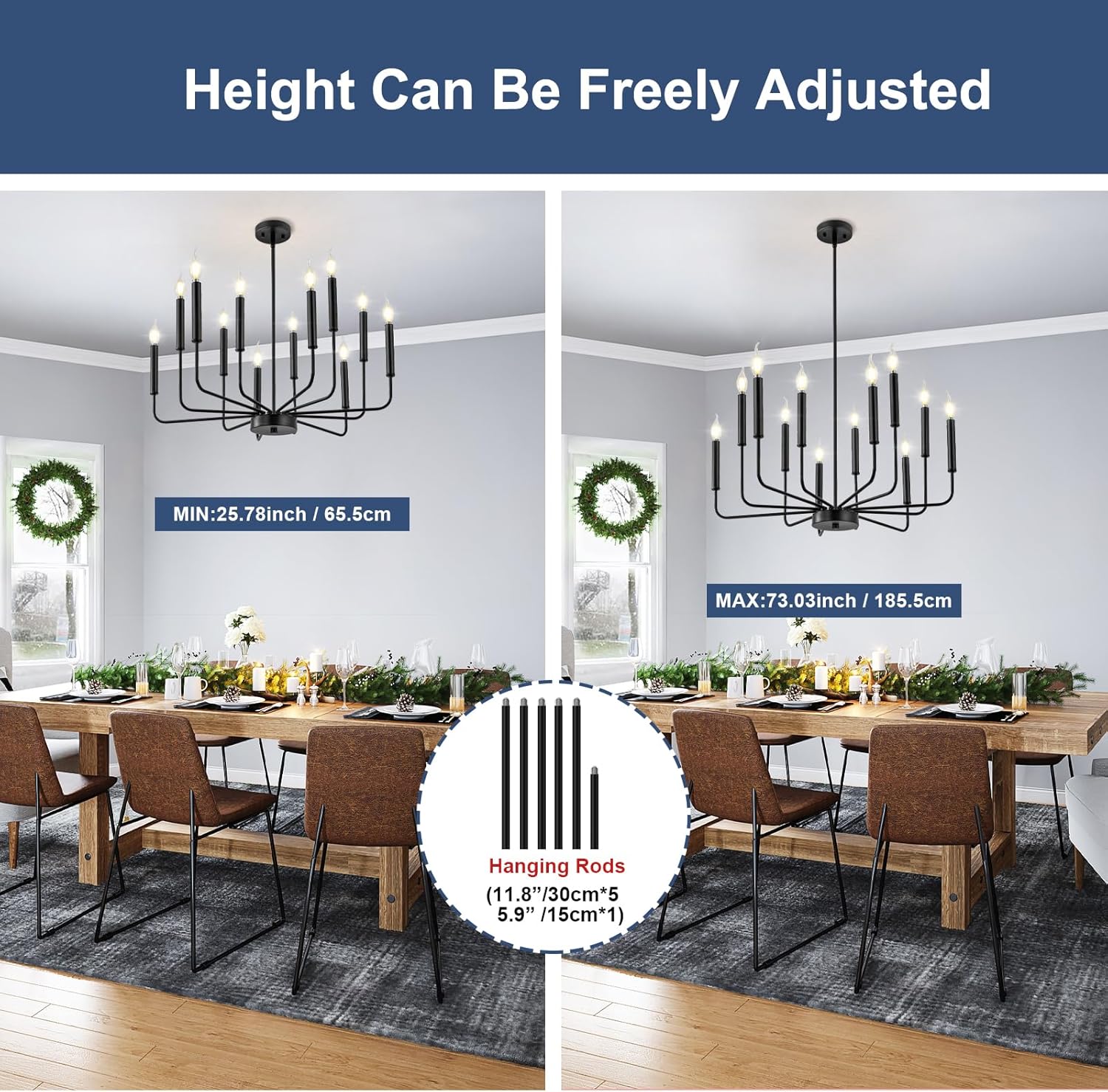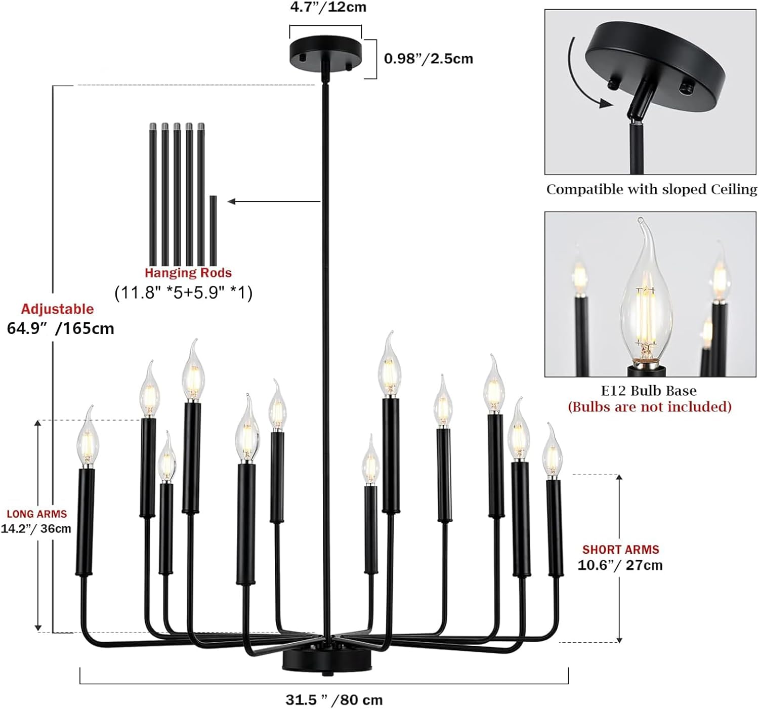 - Modern Fashion Design: A classy candelabra chandelier with different lengths of arms and black matte finish which allows you to clean easily. The appearance of 12 uneven arms look genuine and novel. The whole minimalist design is classic but not rigid. With this simple and retro look can upgrade your space that is elegant but generous