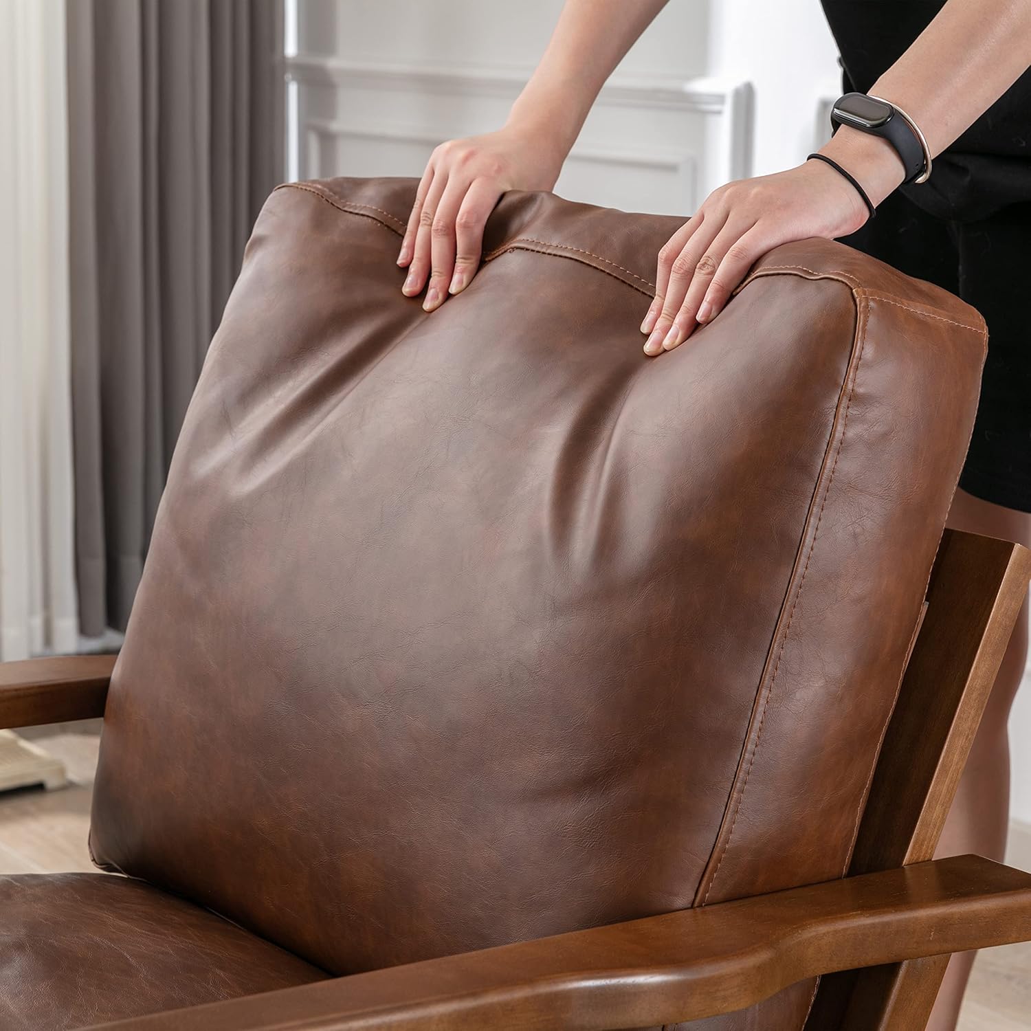 - Mid-century lounge chair, two super soft cushions are upholstered in brown PU leather which adds a retro touch to this accent chair. Both backrest and seat cushions are REMOVABLE