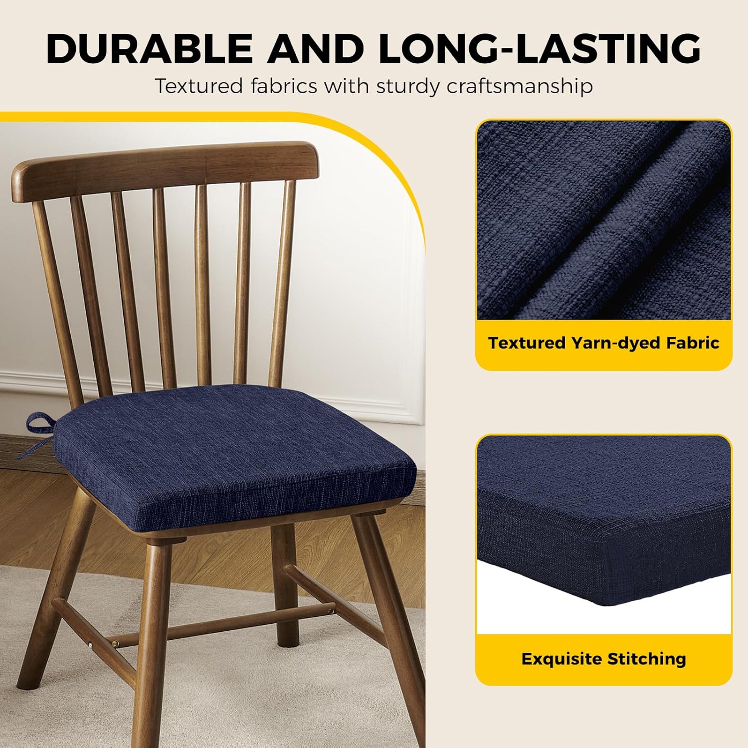 downluxe Indoor Chair Cushions for Dining Chairs, Soft and Comfortable Textured Foam Kitchen Chair Pads with Ties and Non-Slip Backing, 16" x 16" x 2", Navy, 4 Pack