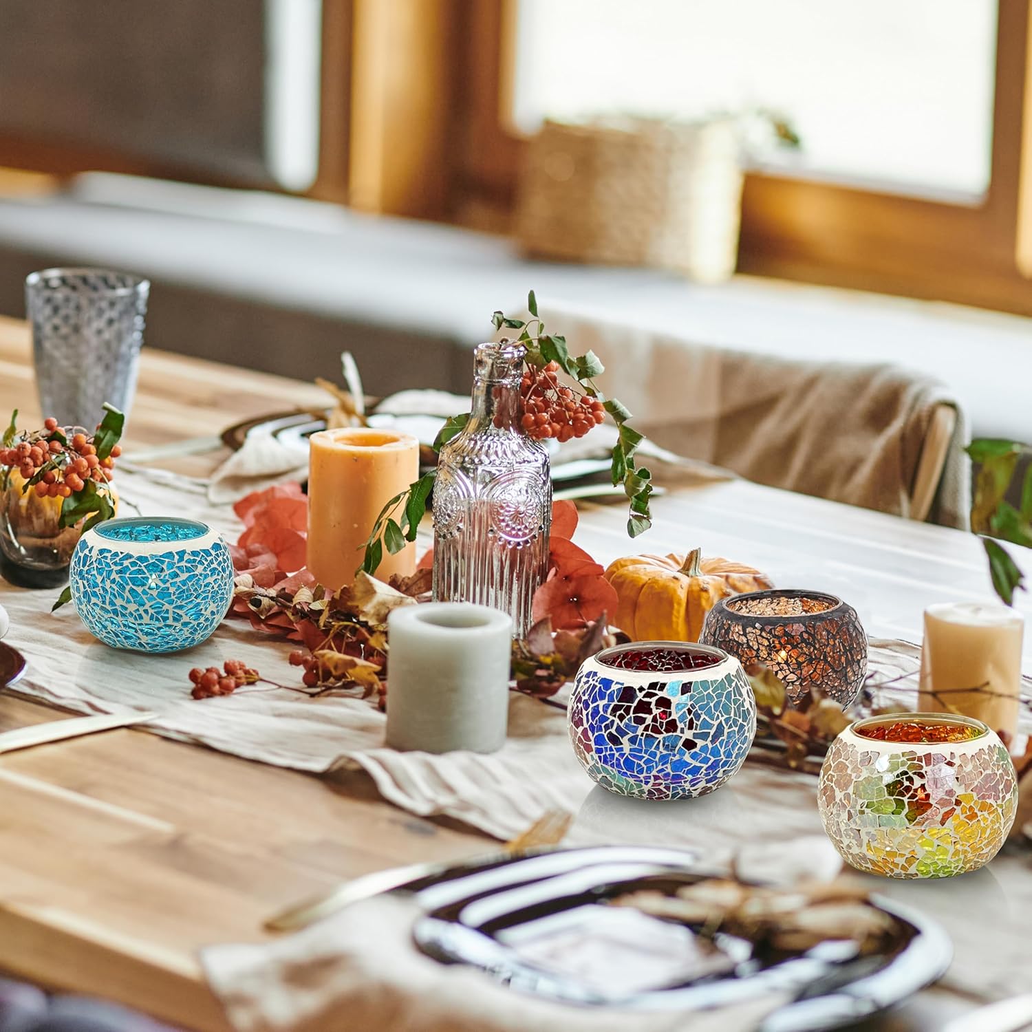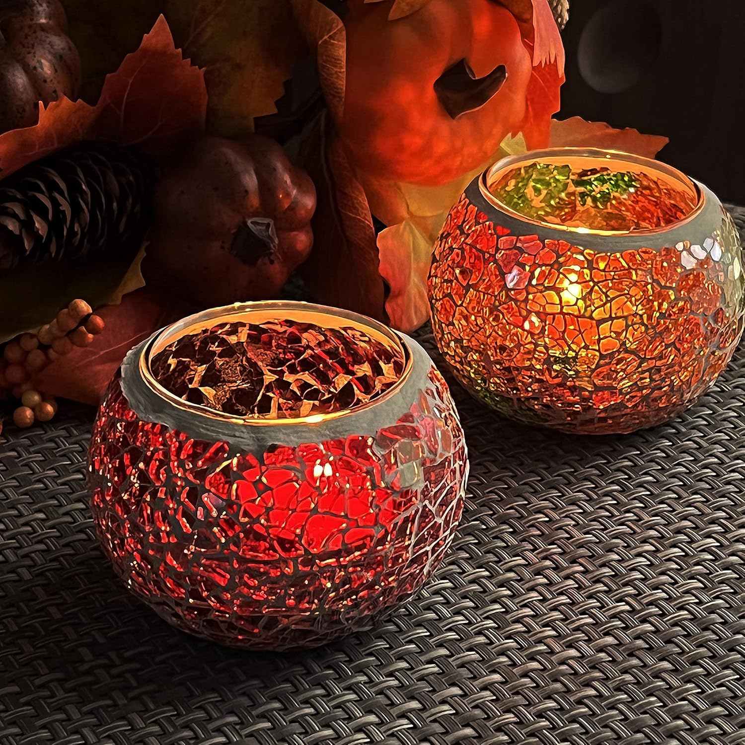 SHMILMH Mosaic Glass Candle Holder Set of 4, Votive Candle Holders Handmade Cracked Tealight Holders for Fall Christmas Diwali Home Decorations, Diwali Gift