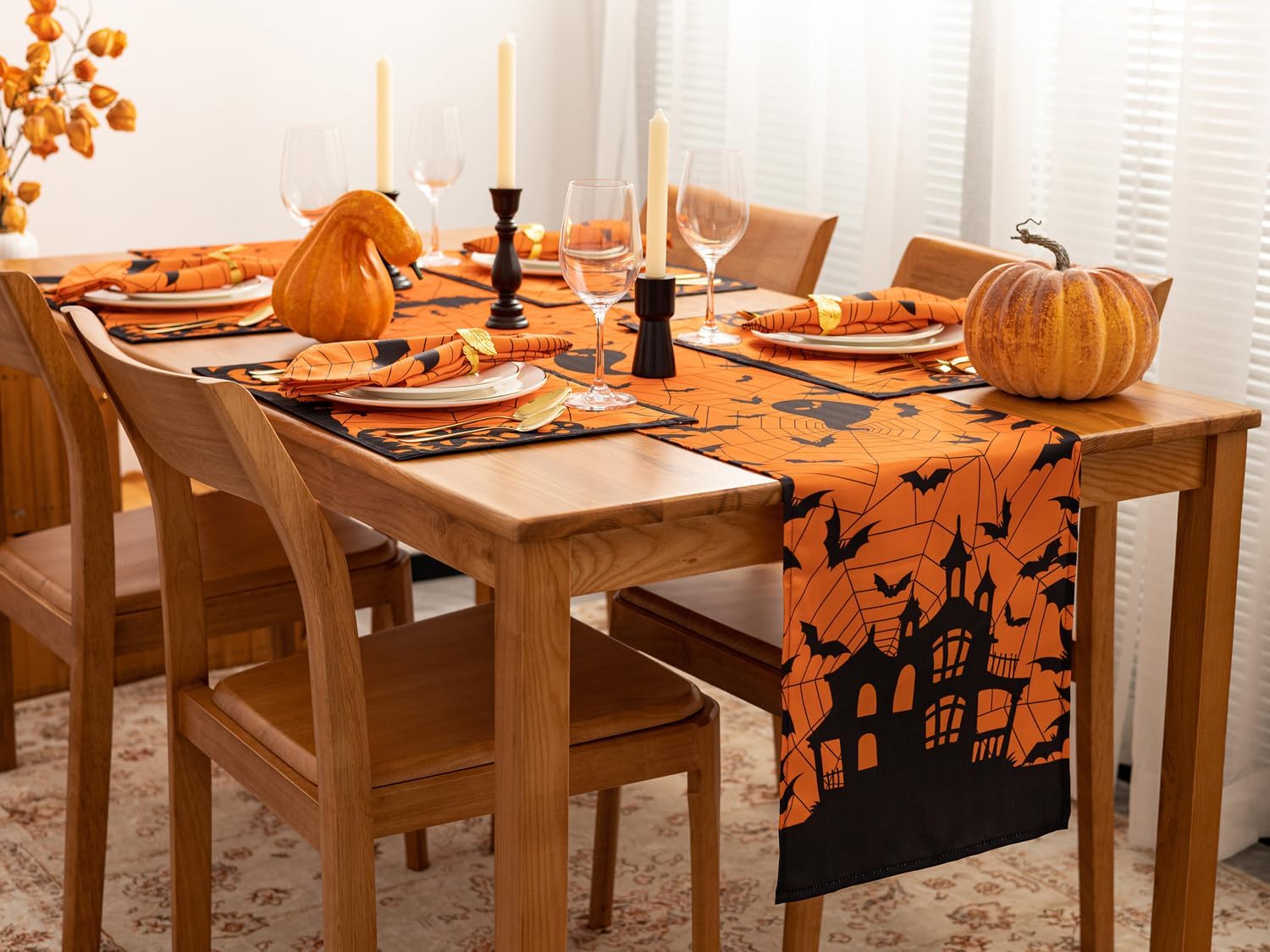 - ADD A CREEPY FINISHING TOUCH: This printed table runner is the perfect addition to decorate your tabletop for Halloween parties; The black haunted house design and hanging bats and spider web over the orange table runner make a cute, festive decoration.