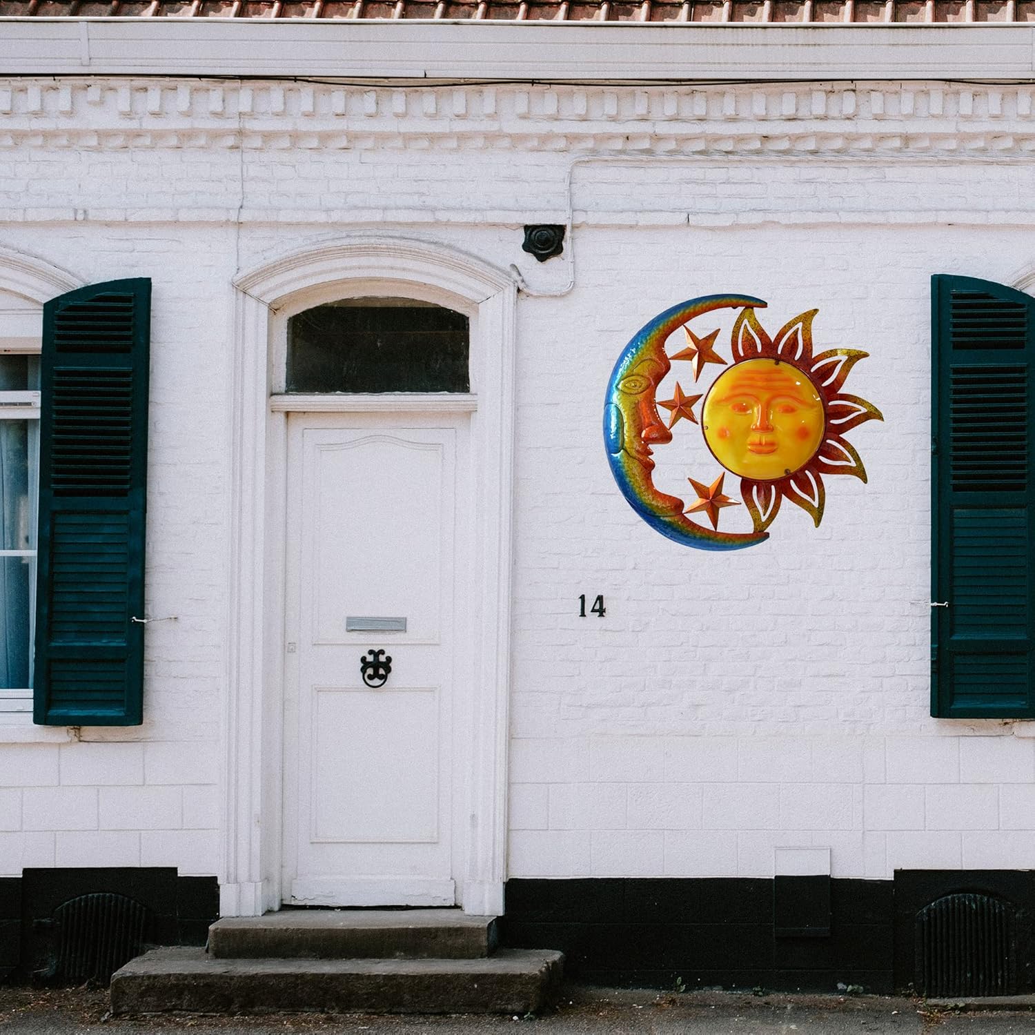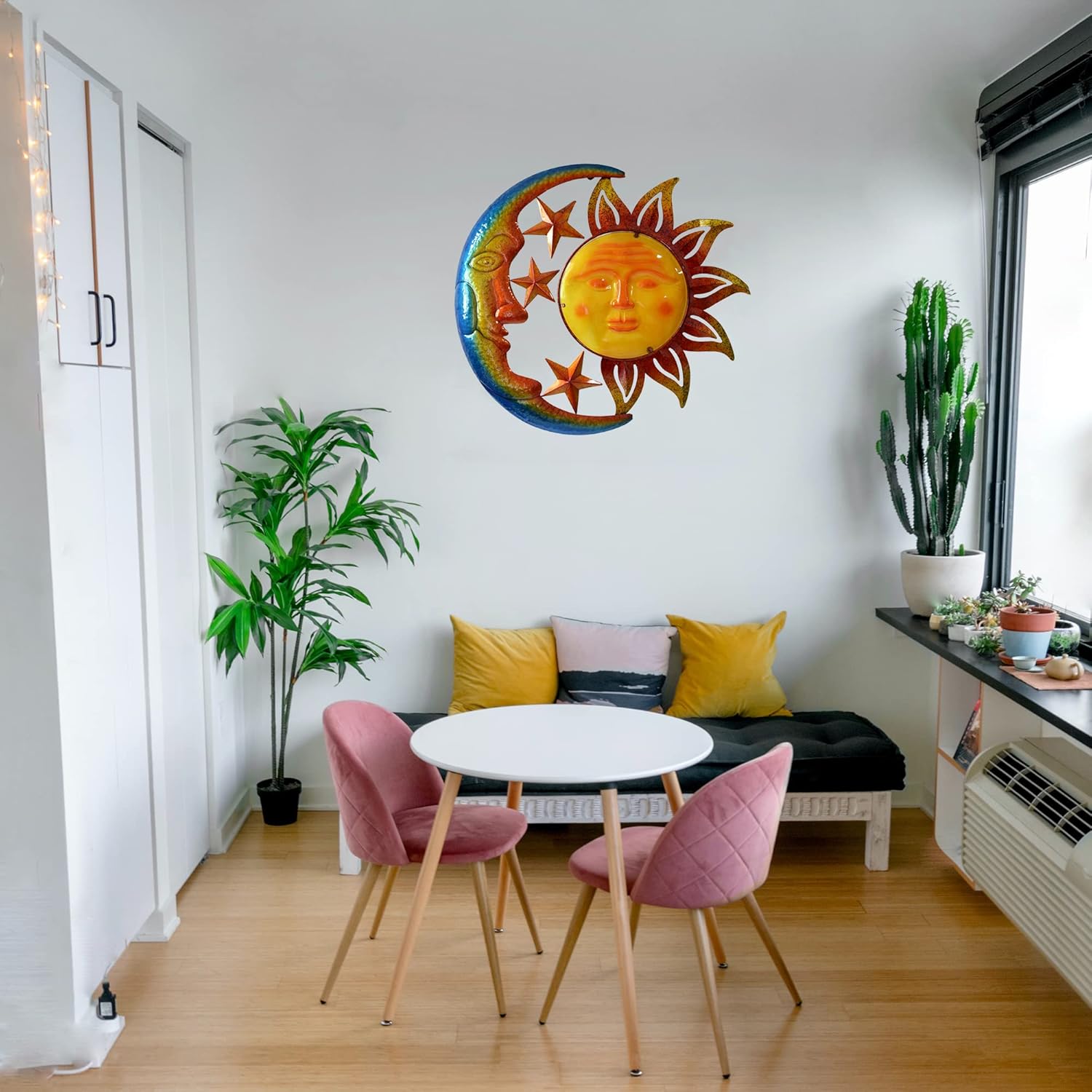 - 【Enthusiastic super large sun wall decor】:30 inch* 27 inch larger metal & glass sun wall decor. A wall decor consists of glass sun face, metal stars, metal moon & flame frame. This sun decor is a great focal point for any indoor or outdoor space.