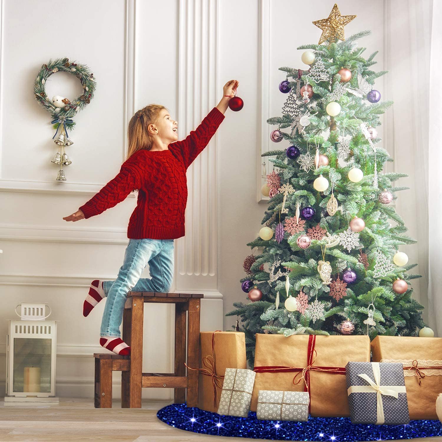 - ❄️【Size Detail -Shiny Sequins Tree Skirt】You will receive a 46 inches diameter royal blue glitter sequins tree skirt, fits under 8 foot tall trees. You can put some gifts, Christmas boxes, christmas ball on the xmas tree cover mat. The sparkle velour Christmas tree skirts is perfect for decorating your home and become part of your holiday tradition.