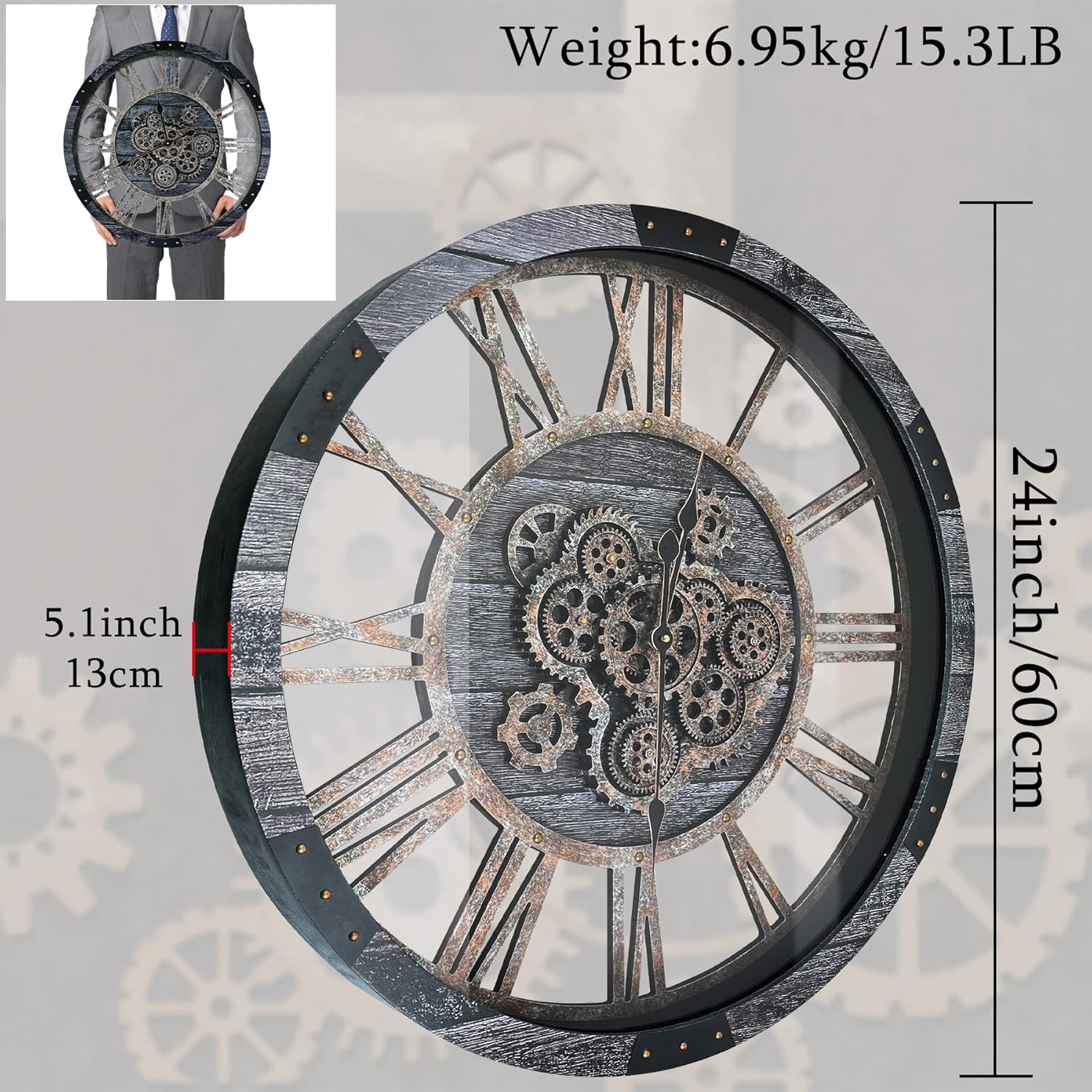 - 🕕Industrial Steampunk Design: Elevate your decor with this elegant and understated moving gear wall clock featuring an industrial steampunk design. With a 24 inch (60cm) diameter and 3.2 inch (8cm) depth, it’s the perfect accessory for any room, from living rooms and offices to kitchens and more.