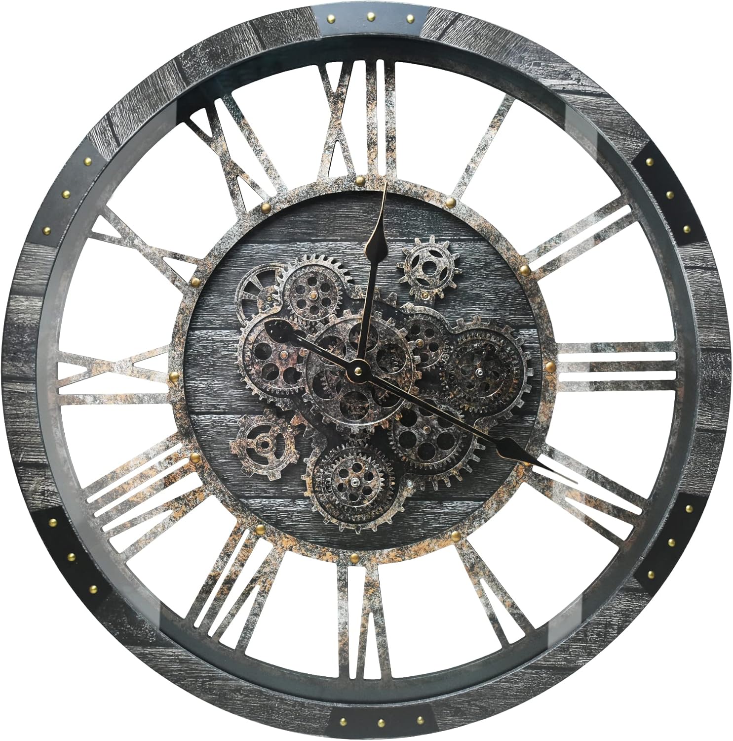 - đ§ăReal Moving Gears Wall ClockăThe large rustic wall clock is design with multi-real moving gears, put battery in, various gears start working, makes a subtle relaxing sound and makes a living element in the environment in where it is placed, vintage and magical, catch all eyes of visits
