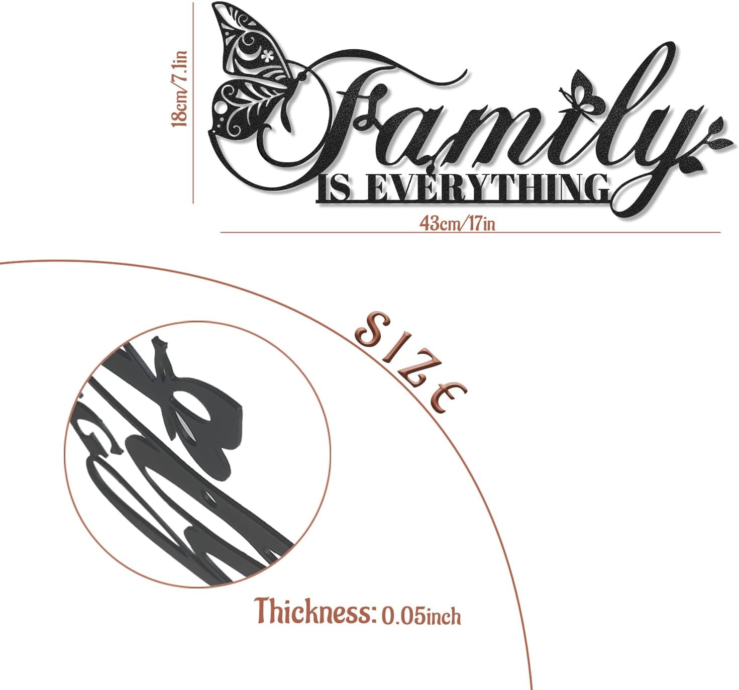 Family Signs Metal Wall Decor, Oppro Family Is Everything Word Sign with Butterfly for Home Decor, Black Art Plaque Letters for Living Room, Dining Room Bedroom Housewarming Mother's Day Father's Day Gift , 17”x6.3”