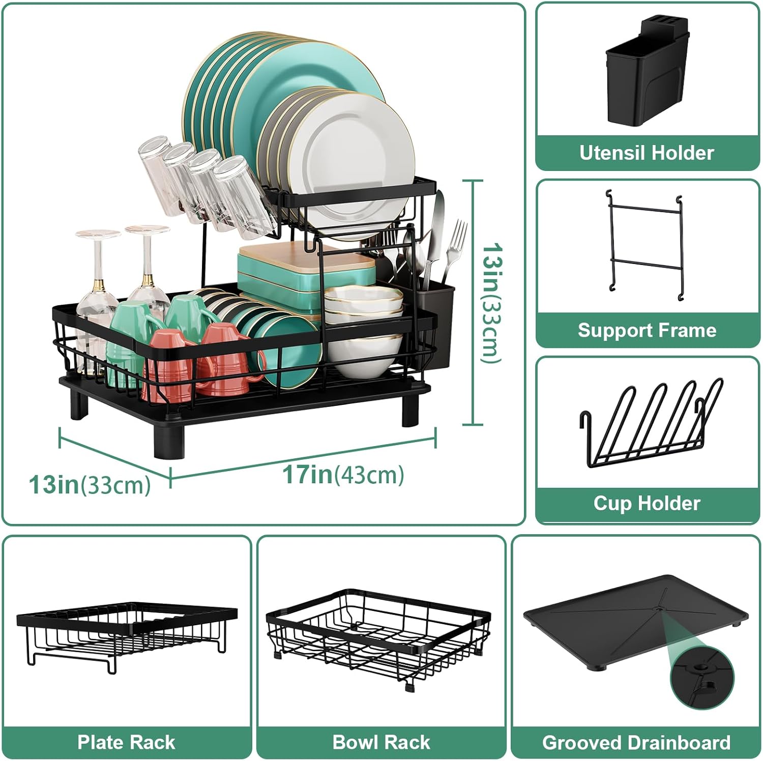 - 𝟐 𝐓𝐈𝐄𝐑 𝐋𝐀𝐑𝐆𝐄 𝐂𝐀𝐏𝐀𝐂𝐈𝐓𝐘:Our dish racks measures 16.9"D x 12.9"W x 12.9"H(43 D x 33W x 33 H cm),with plate rack,bowl rack,cup holder and silverware organizer store 10 plates,16 bowls,12 cups or glasses and lots of tableware,the dish drainers for kitchen counter is large enough for a family of 6 to use daily