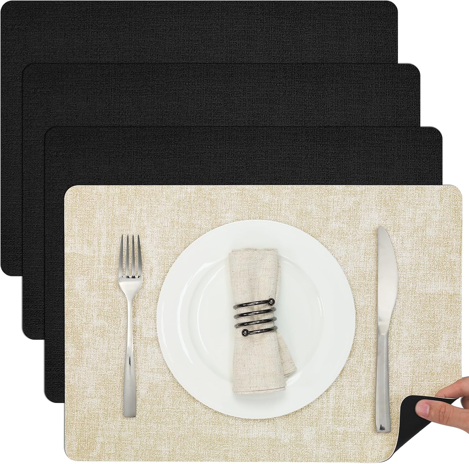 - These placemats are made of faux leather, the sufface texture imitate the linen. Unlike woven or fabric placemats, these placemats are water resistant, they can block the sauce or any liquids to protect the desktop.